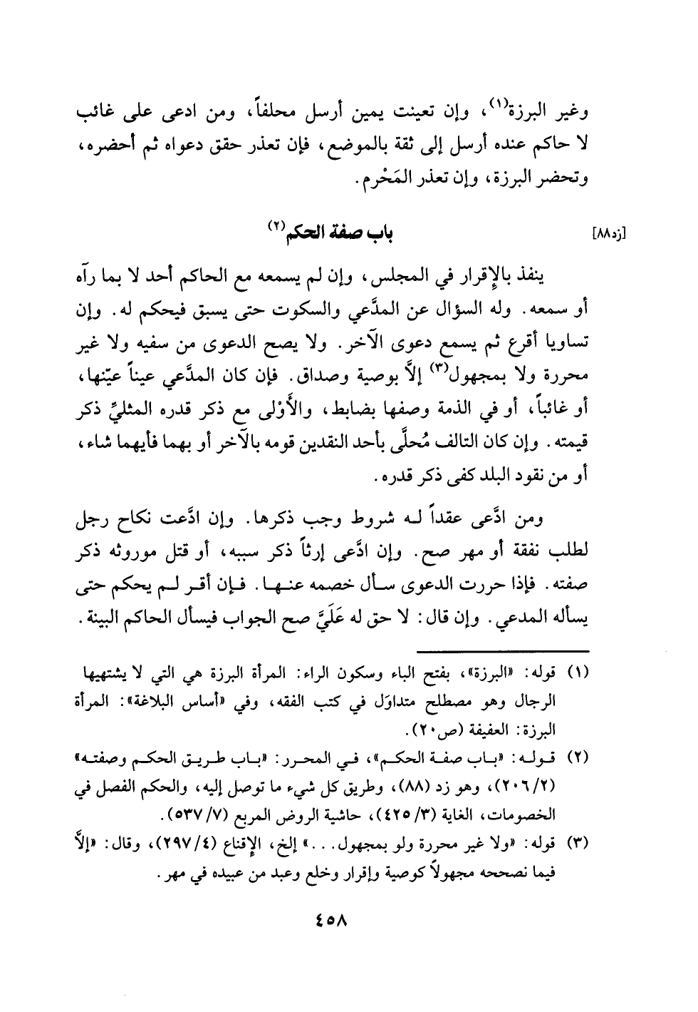 (¬2) قوله: "باب صفة الحكم"، في المحرر: "باب طريق الحكم وصفته" (2/ 206)، وهو زد (88)، وطريق كل شيء ما توصل إليه، والحكم الفصل في الخصومات، الغاية (3/ 425)، حاشية الروض المربع (7/ 537).