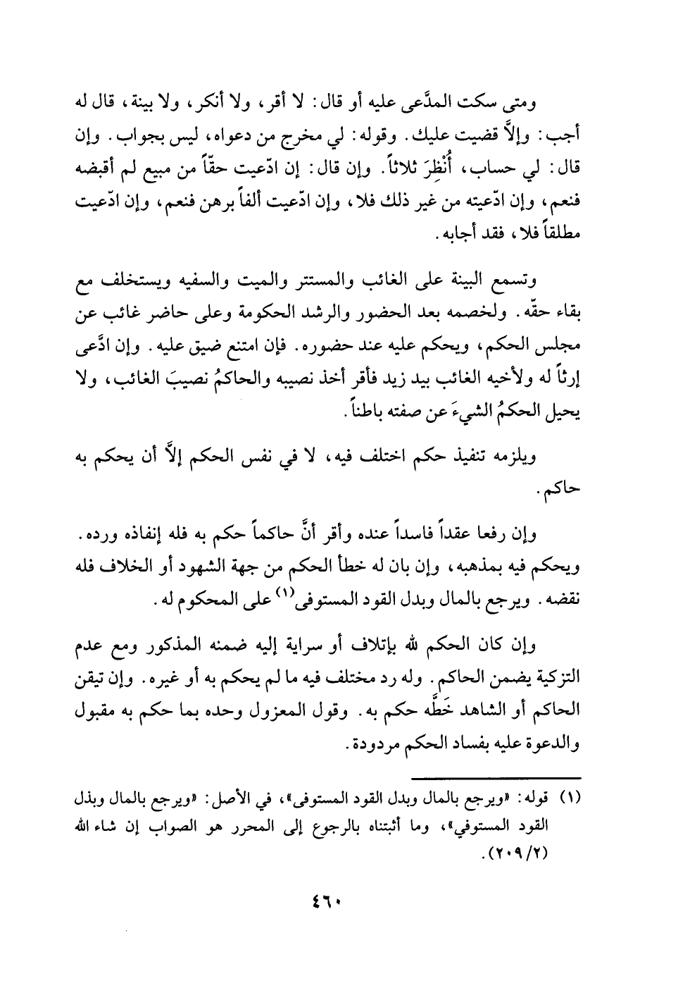 وتسمع البينة على الغائب والمستتر والميت والسفيه ويستخلف مع بقاء حقّه. ولخصمه بعد الحضور والرشد الحكومة وعلى حاضر غائب عن مجلس الحكم، ويحكم عليه عند حضوره. فإن امتنع ضيق عليه. وإن ادَّعى إرثًا له ولأخيه الغائب بيد زيد فأقر أخذ نصيبه والحاكمُ نصيبَ الغائب، ولا يحيل الحكمُ الشيءَ عن صفته باطنًا.