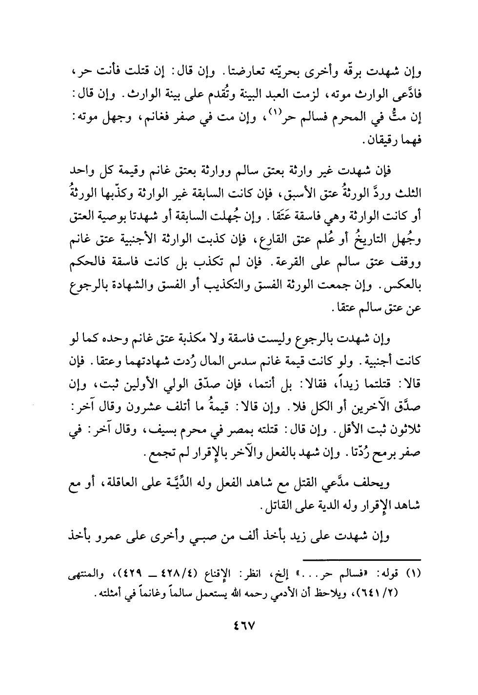 (¬1) قوله: "فسالم حر. . . " إلخ، انظر: الإِقناع (4/ 428 - 429)، والمنتهى (2/ 641)، ويلاحظ أن الأدمي رحمه اللَّه يستعمل سالمًا وغانمًا في أمثلته.