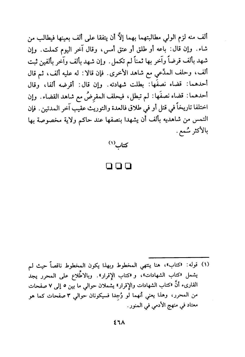 (¬1) قوله: "كتاب"، هنا ينتهي المخطوط وبهذا يكون المخطوط ناقصًا حيث لم يشمل "كتاب الشهادات"، و"كتاب الإقرار". وبالاطِّلاع على المحرر يجد القارئ أن "كتاب الشهادات والإِقرار" يشملان حوالي ما بين 5 إلى 7 صفحات من المحرر، وهذا يعني أنهما لو وُجِدا فسيكونان حوالي 3 صفحات كما هو معتاد في منهج الأدمي في المنور.