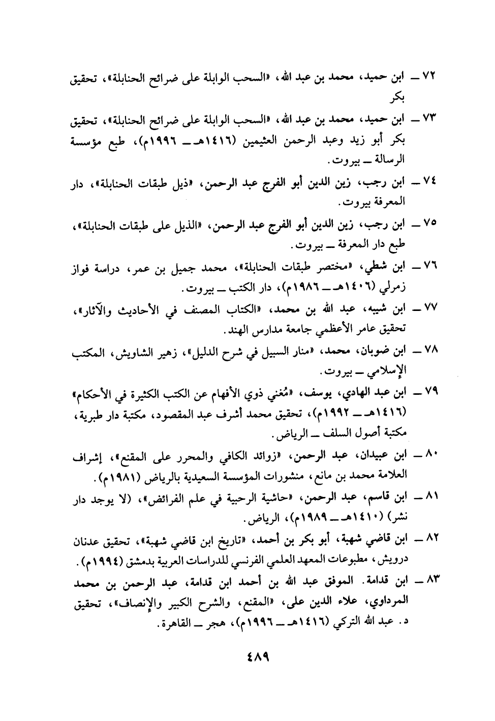 73 - ابن حميد، محمد بن عبد اللَّه، "السحب الوابلة على ضرائح الحنابلة"، تحقيق بكر أبو زيد وعبد الرحمن العثيمين (1416 هـ - 1996 م)، طبع مؤسسة الرسالة- بيروت.