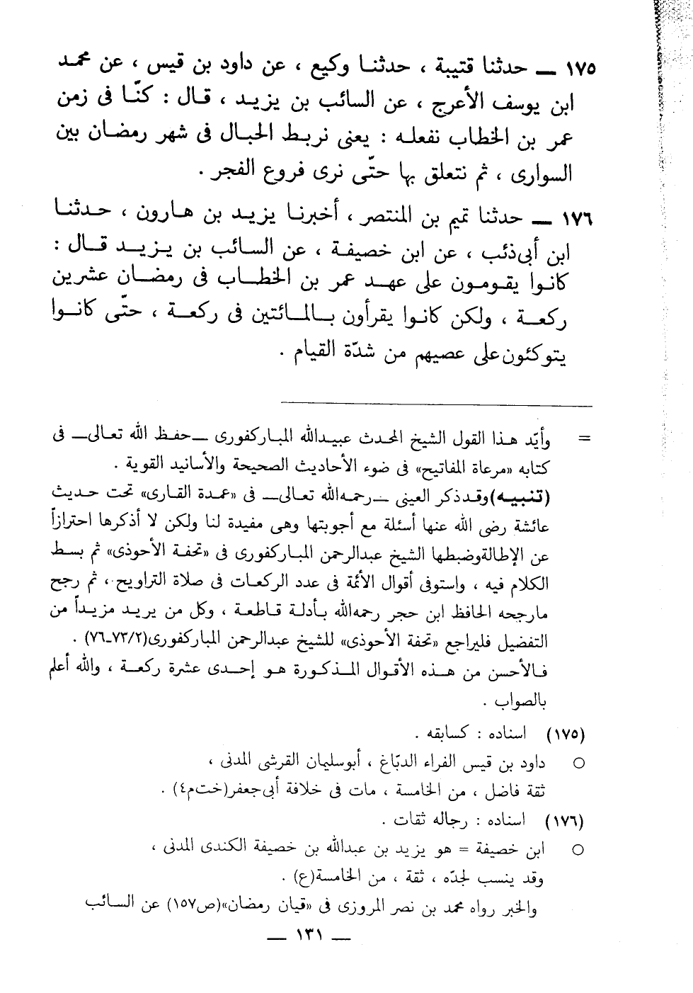 176 - حَدَّثَنَا تَمِيمُ بْنُ الْمُنْتَصِرِ، أَخْبَرَنَا يَزِيدُ بْنُ هَارُونَ، حَدَّثَنَا ابْنُ أَبِي ذِئْبٍ، عَنِ ابْنِ خُصَيْفَةَ، عَنِ السَّائِبِ بْنِ يَزِيدَ قَالَ كَانُوا «§يَقُومُونَ عَلَى عَهْدِ عُمَرَ بْنِ الْخَطَّابِ فِي رَمَضَانَ عِشْرِينَ رَكْعَةً، وَلَكِنْ كَانُوا يَقْرَءُونَ بِالْمِائَتَيْنِ فِي رَكْعَةٍ حَتَّى كَانُوا يَتَوَكَّئُونَ عَلَى عِصِيِّهِمْ مِنْ شِدَّةِ الْقِيَامِ»