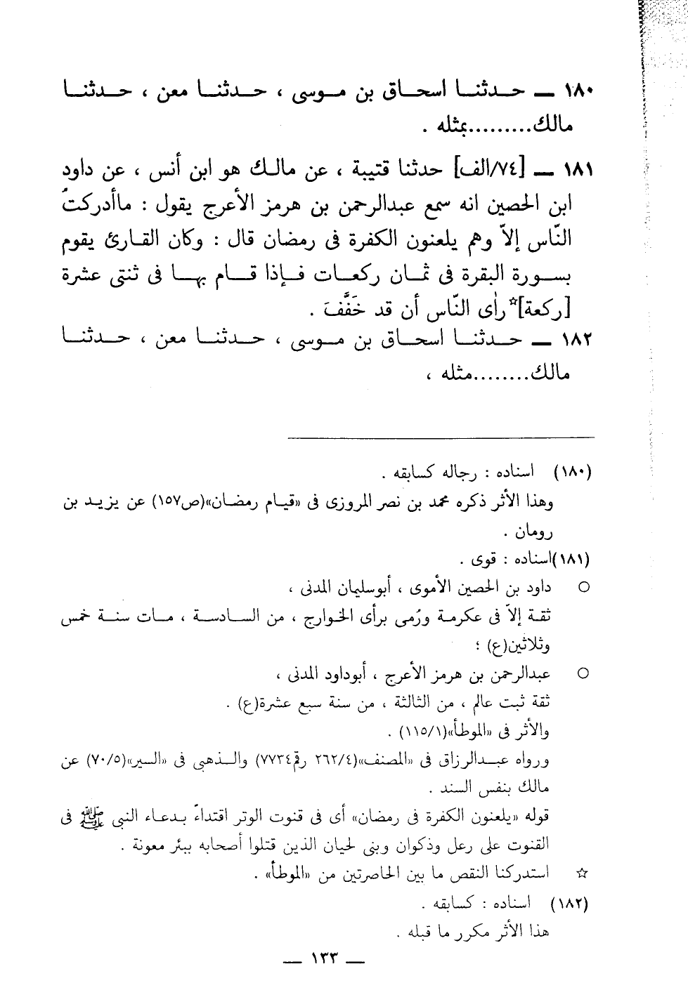 181 - حَدَّثَنَا قُتَيْبَةُ، عَنْ مَالِكٍ هُوَ ابْنُ أَنَسٍ، عَنْ دَاوُدَ بْنِ الْحُصَيْنِ، أَنَّهُ سَمِعَ عَبْدَ الرَّحْمَنِ بْنَ هُرْمُزَ الْأَعْرَجَ، يَقُولُ: " §مَا أَدْرَكْتُ النَّاسَ إِلَّا وَهُمْ يَلْعَنُونَ الْكَفَرَةَ فِي رَمَضَانَ قَالَ: وَكَانَ الْقَارِئُ يَقُومُ بِسُورَةِ الْبَقَرَةِ فِي ثَمَانِ رَكَعَاتٍ، فَإِذَا قَامَ بِهَا فِي اثْنَتَيْ عَشْرَةَ رَكْعَةً رَأَى النَّاسُ أَنْ قَدْ خَفَّفَ "