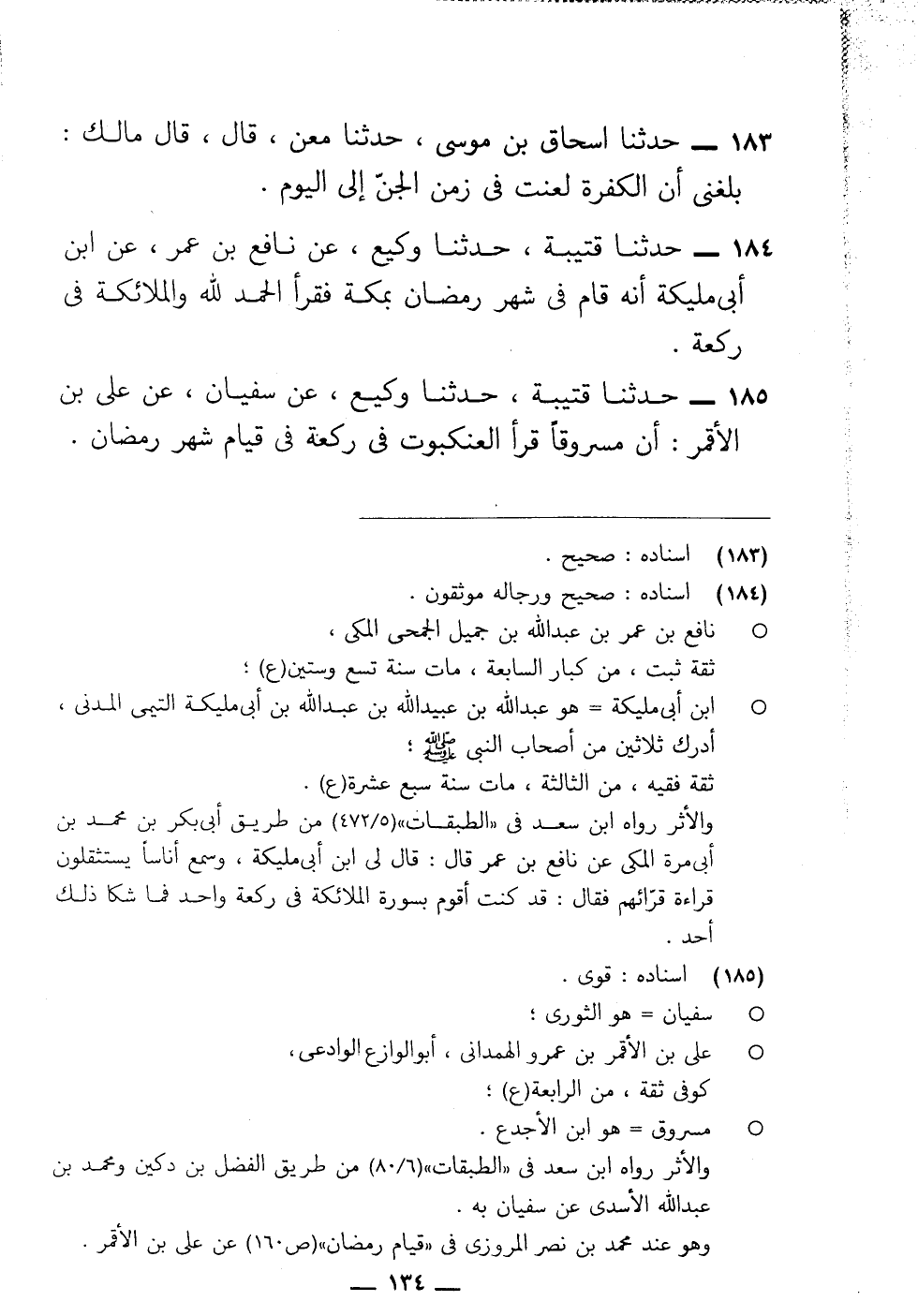 185 - حَدَّثَنَا قُتَيْبَةُ، حَدَّثَنَا وَكِيعٌ، عَنْ سُفْيَانَ، عَنْ عَلِيِّ بْنِ الْأَقْمَرِ، أَنَّ مَسْرُوقًا «§قَرَأَ الْعَنْكَبُوتَ فِي رَكْعَةٍ فِي قِيَامِ شَهْرِ رَمَضَانَ»