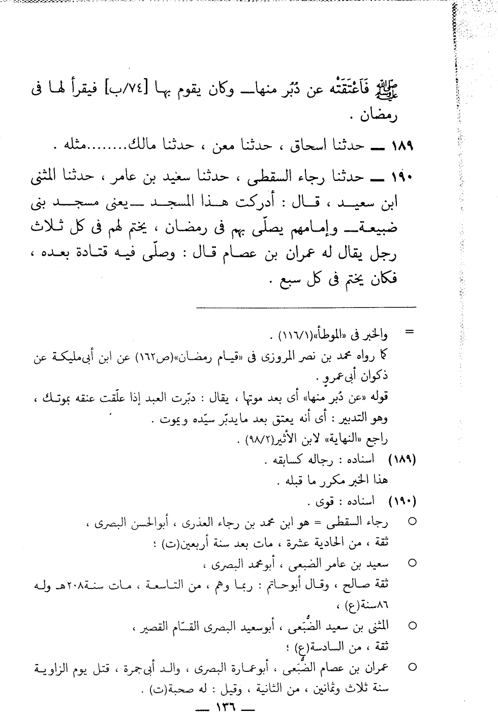 190 - حَدَّثَنَا رَجَاءٌ السَّقَطِيُّ، حَدَّثَنَا سَعِيدُ بْنُ عَامِرٍ، حَدَّثَنَا الْمُثَنَّى بْنُ سَعِيدٍ قَالَ: " §أَدْرَكْتُ هَذَا الْمَسْجِدَ يَعْنِي مَسْجِدَ بَنِي ضُبَيْعَةَ وَإِمَامُهُمْ يُصَلَّى بِهِمْ فِي رَمَضَانَ يَخْتِمُ لَهُمْ فِي كُلِّ ثَلَاثٍ رَجُلٌ يُقَالُ لَهُ عِمْرَانُ بْنُ عِصَامٍ قَالَ: وَصَلَّى فِيهِ قَتَادَةُ بَعْدَهُ، فَكَانَ يَخْتِمُ فِي كُلِّ سَبْعٍ "