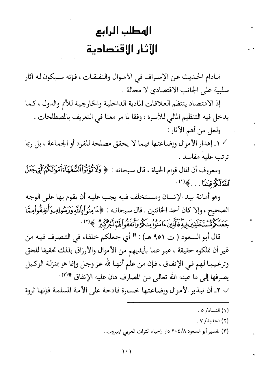 المطلب الرابع: الآثار الاقتصادية ما دام الحديث عن الإسراف في الأموال والنفقات، فإنه سيكون له آثار سلبية على الجانب الاقتصادي لا محالة.