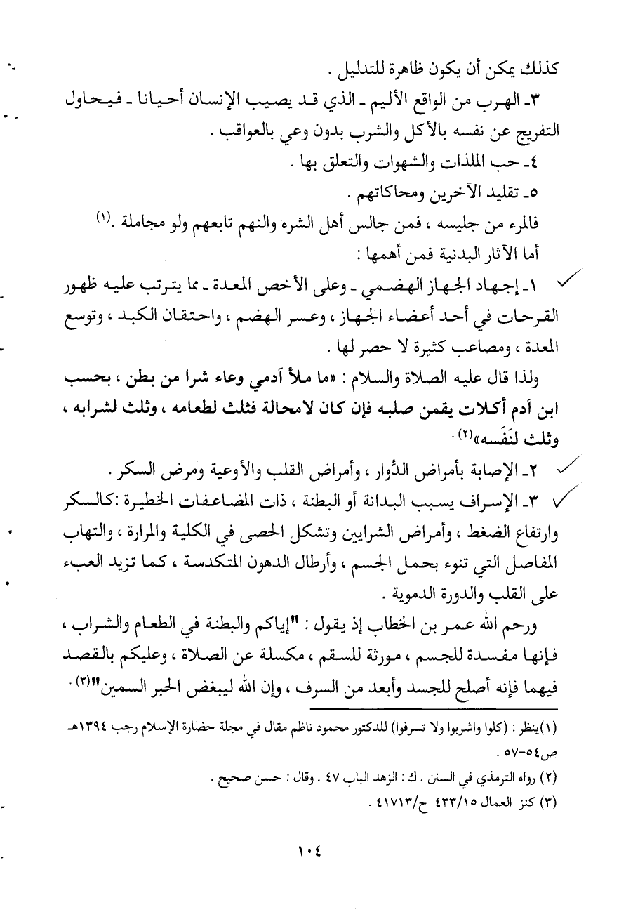 (¬1) ينظر: (كلوا واشربوا ولا تسرفوا) للدكتور محمود ناظم، مقال في مجلة حضارة الإسلام رحب 1394 هـ ص 54 - 57.