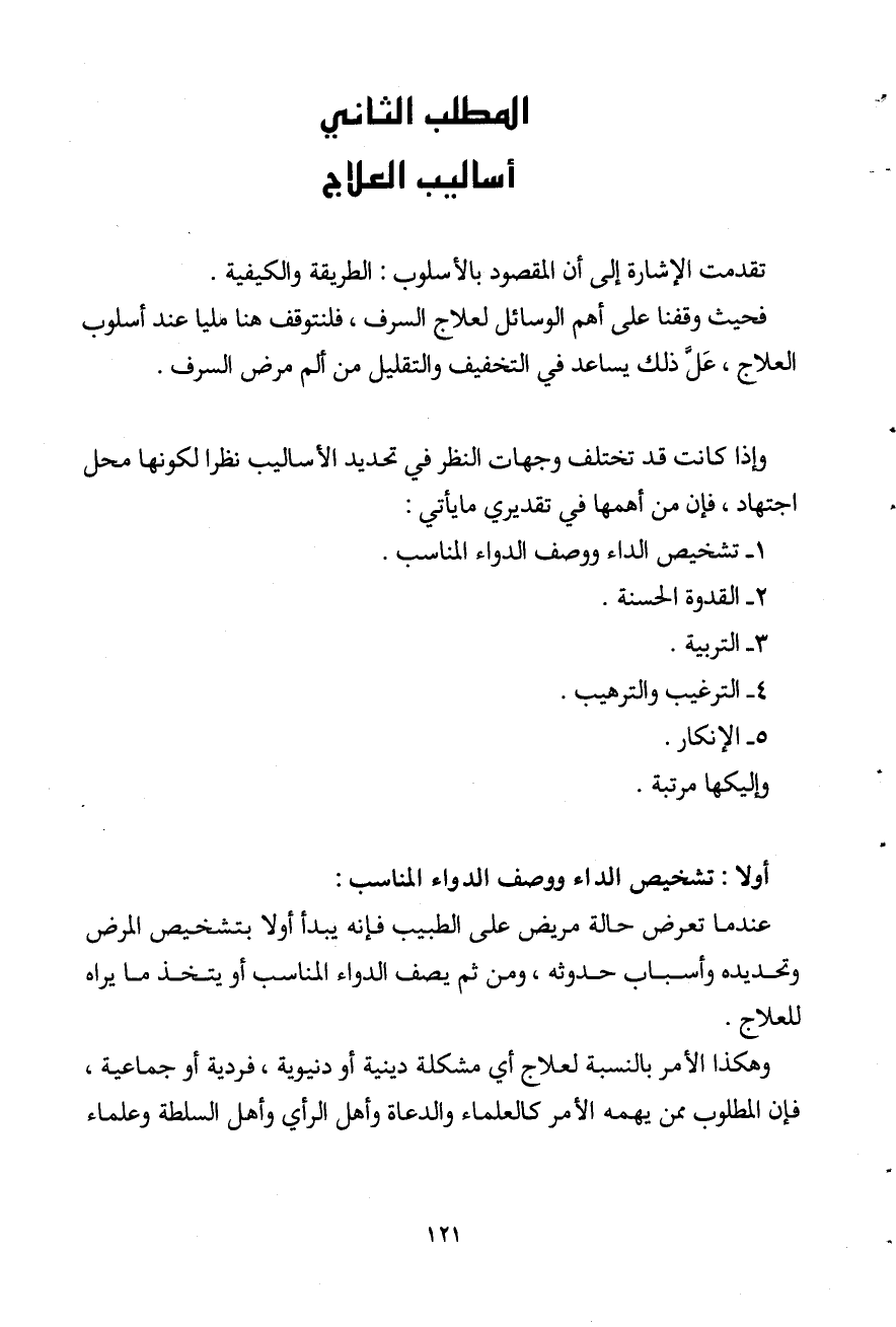 فحيث وقفنا على أهم الوسائل لعلاج السرف، فلنتوقف هنا مليا عند أسلوب العلاج، علَّ ذلك يساعد في التخفيف والتقليل من ألم مرض السرف.