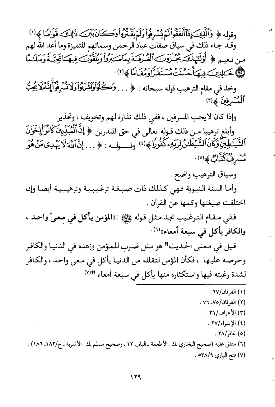 وخذ في مقام الترهيب قوله سبحانه:. . {وَكُلُوا وَاشْرَبُوا وَلَا تُسْرِفُوا إِنَّهُ لَا يُحِبُّ الْمُسْرِفِينَ} [الأعراف: 31] (¬3) .