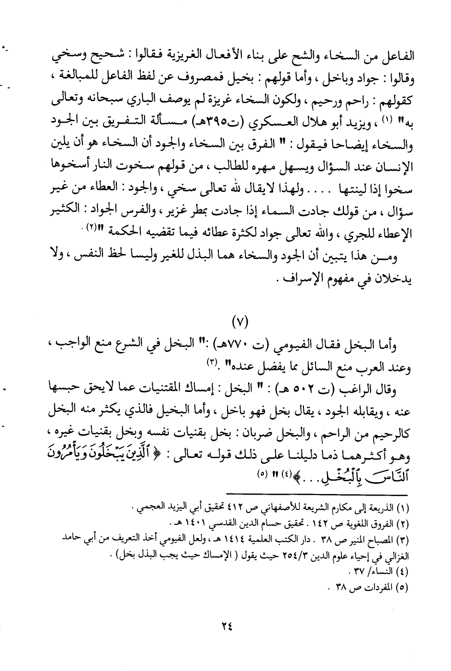 (¬3) المصباح المنير ص38. دار الكتب العلمية 1414هـ، ولعل الفيومي أخذ التعريف من أبي حامد الغزالي في إحياء علوم الدين 3 / 254 حيث يقول (الإمساك حيث يجب البذل بخل) .