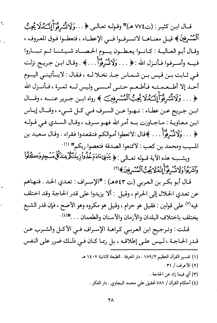 قال ابن كثير: (ت 774 هـ) " وقوله تعالى. . . {وَلَا تُسْرِفُوا إِنَّهُ لَا يُحِبُّ الْمُسْرِفِينَ} [الأنعام: 141] قيل معناها: لا تسرفوا في الإعطاء، فتعطوا فوق المعروف، وقال أبو العالية: كانوا يعطون يوم الحصاد شيئا ثم تباروا فيه وأسرفوا فأنزل الله:. . {وَلَا تُسْرِفُوا} [الأنعام: 141] وقال ابن جريج نزلت في ثابت بن قيس بن شماس جذ نخلا له، فقال: لا يأتيني اليوم أحد إلا أطعمته فأطعم حتى أمسى وليس له ثمرة، فأنزل الله. . . {وَلَا تُسْرِفُوا إِنَّهُ لَا يُحِبُّ الْمُسْرِفِينَ} [الأنعام: 141] رواه ابن جرير عنه، وقال ابن جريج عن عطاء: نهوا عن السرف في كل شيء، وقال إياس بن معاوية: ما جاوزت به أمر الله فهو سرف، وقال السدي في قوله. . . {وَلَا تُسْرِفُوا} [الأنعام: 141] فقال: لا تعطوا أموالكم فتقعدوا فقراء. وقال سعيد بن المسيب ومحمد بن كعب: لا تمنعوا الصدقة فتعصوا ربكم " (¬1) .