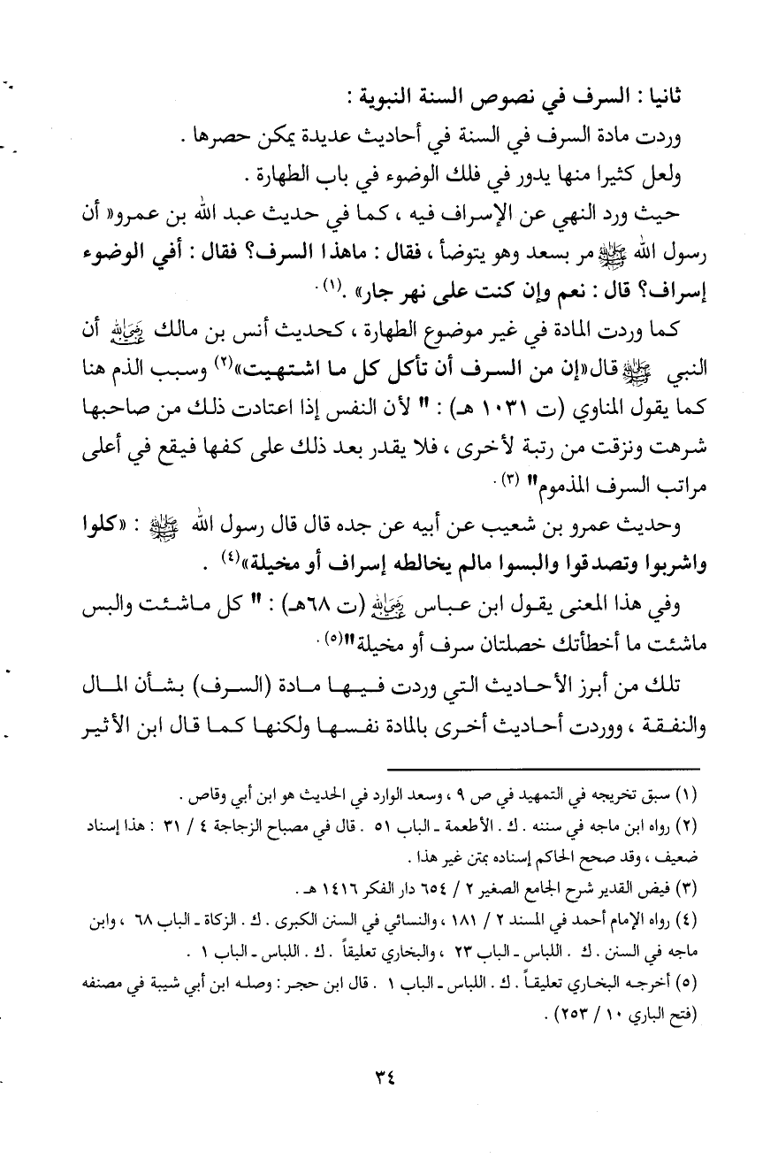 ثانيا: السرف في نصوص السنة النبوية: وردت مادة السرف في السنة في أحاديث عديدة يمكن حصرها.