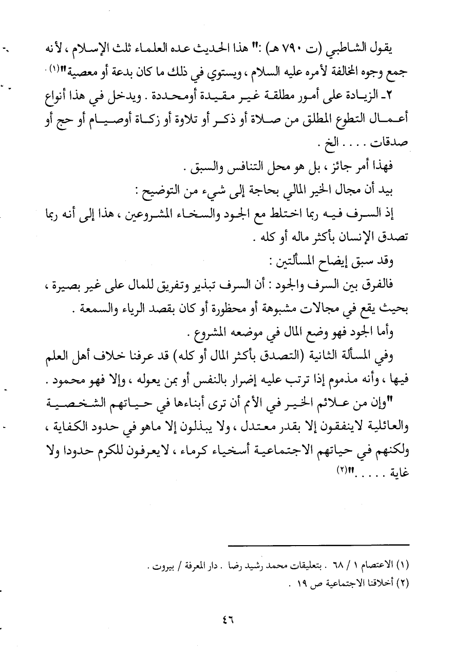 " وإن من علائم الخير في الأمم أن ترى أبناءها في حياتهم الشخصية والعائلية لا ينفقون إلا بقدر معتدل، ولا يبذلون إلا ما هو في حدود الكفاية، ولكنهم في حياتهم الاجتماعية أسخياء كرماء، لا يعرفون للكرم حدودا ولا غاية. . . . " (¬2) .