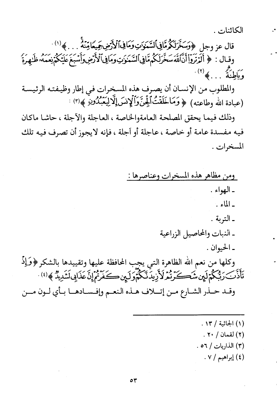 والمطلوب من الإنسان أن يصرف هذه المسخرات في إطار وظيفته الرئيسة (عبادة الله وطاعته) {وَمَا خَلَقْتُ الْجِنَّ وَالْإِنْسَ إِلَّا لِيَعْبُدُونِ} [الذاريات: 56] (¬3) .