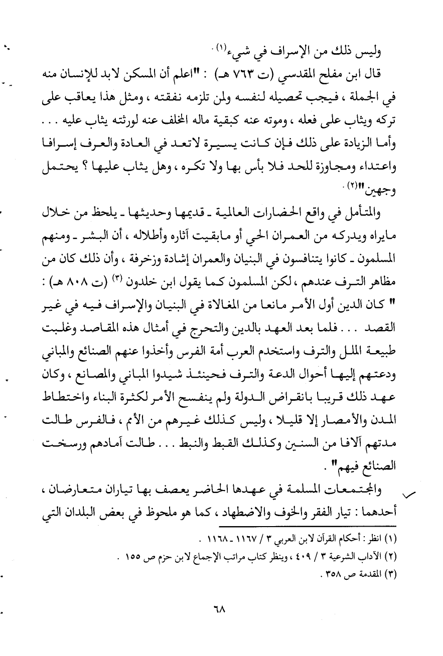 والمتأمل في واقع الحضارات العالمية - قديمها وحديثها - يلحظ من خلال ما يراه ويدركه من العمران الحي أو ما بقيت آثاره وأطلاله، أن البشر - ومنهم المسلمون - كانوا يتنافسون في البنيان والعمران إشادة وزخرفة، وأن ذلك كان من مظاهر الترف عندهم، لكن المسلمون كما يقول ابن خلدون (¬3) (ت 808 هـ) : " كان الدين أول الأمر مانعا من المغالاة في البنيان والإسراف فيه في غير القصد. . . فلما بعد العهد بالدين والتحرج في أمثال هذه المقاصد وغلبت طبيعة الملل والترف واستخدم العرب أمة الفرس وأخذوا عنهم الصنائع والمباني ودعتهم إليها أحوال الدعة والترف فحينئذ شيدوا المباني والمصانع، وكان عهد ذلك قريبا بانقراض الدولة ولم ينفسح الأمر لكثرة البناء واختطاط المدن والأمصار إلا قليلا، وليس كذلك غيرهم من الأمم، فالفرس طالت مدتهم آلافا من السنين وكذلك القبط والنبط. . . طالت آمادهم ورسخت الصنائع فيهم ".