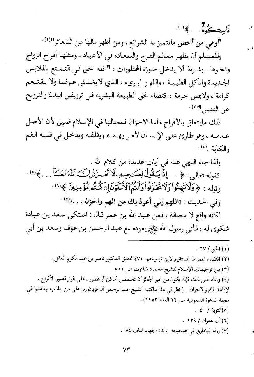 ذلك ما يتعلق بالأفراح، أما الأحزان فمجالها في الإسلام ضيق لأن الأصل عدمه، وهو طارئ على الإنسان لأمر يهمه ويقلقه ويدخل في قلبه الغم والكآبة (¬3) .