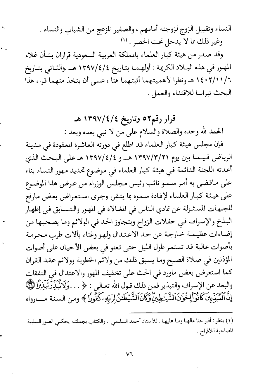 فإن مجلس هيئة كبار العلماء قد اطلع في دورته العاشرة المعقودة في مدينة الرياض فيما بين يوم 21 / 3 / 1397 هـ و4 / 4 / 1397 هـ على البحث الذي أعدته اللجنة الدائمة في هيئة كبار العلماء في موضوع تحديد مهور النساء بناء على ما قضى به أمر سمو نائب رئيس مجلس الوزراء من عرض هذا الموضوع على هيئة كبار العلماء لإفادة سموه بما يتقرر وجرى استعراض بعض ما رفع للجهات المسئولة عن تمادي الناس في المغالاة في المهور والتسابق في إظهار البذخ والإسراف في حفلات الزواج وبتجاوز الحد في الولائم وما يصحبها من إضاءات عظيمة خارجة عن حد الاعتدال ولهو وغناء بآلات طرب محرمة بأصوات عالية قد تستمر طول الليل حتى تعلو في بعض الأحيان على أصوات المؤذنين في صلاة الصبح وما يسبق ذلك من ولائم الخطوبة وولائم عقد القران كما استعرض بعض ما ورد في الحث على تخفيف المهور والاعتدال في النفقات والبعد عن الإسراف والتبذير فمن ذلك قول الله تعالى: (. . . {وَلَا تُبَذِّرْ تَبْذِيرًا - إِنَّ الْمُبَذِّرِينَ كَانُوا إِخْوَانَ الشَّيَاطِينِ وَكَانَ الشَّيْطَانُ لِرَبِّهِ كَفُورًا} [الإسراء: 26 - 27] ومن السنة ما رواه