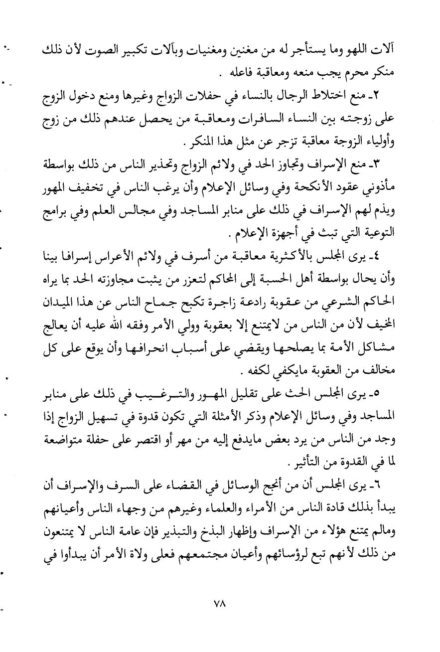 4 - يرى المجلس بالأكثرية معاقبة من أسرف في ولائم الأعراس إسرافا بينا، وأن يحال بواسطة أهل الحسبة إلى المحاكم لتعزر من يثبت مجاوزته الحد بما يراه الحاكم الشرعي من عقوبة رادعة زاجرة تكبح جماح الناس عن هذا الميدان المخيف؛ لأن من الناس من لا يمتنع إلا بعقوبة، وولي الأمر وفقه الله عليه أن يعالج مشاكل الأمة بما يصلحها ويقضي على أسباب انحرافها، وأن يوقع على كل مخالف من العقوبة ما يكفي لكفه.