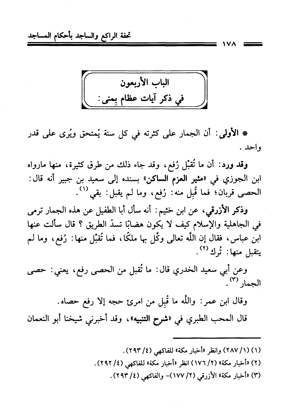 وذكر الأزرقي، عن ابن خثيم: أنه سأل أبا الطفيل عن هذه الجمار ترمى في الجاهلية والإسلام كيف لا يكون هضابًا تسدّ الطريق؟ قال سألت عنها ابن عباس، فقال إن اللَّه تعالى وكَّل بها ملكًا، فما تُقبِّل منها: رُفع، وما لم يتقبل منها: تُرك (¬2).