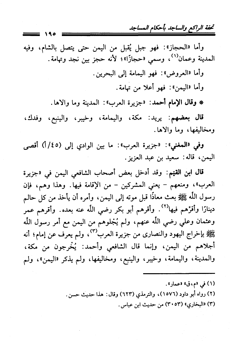 قال ابن القيّم: وقد أدخل بعض أصحاب الشافعي اليمن في "جزيرة العرب"، ومنعهم - يعني المشركين- من الإقامة فيها. وهذا وهم، فإن رسول الله - صلى الله عليه وسلم - بعث معاذًا قبل موته إلى اليمن، وأمره أن يأخذ من كل حالم دينارًا وأقرَّهم فيها (¬2). وأقرهم أبو بكر رضي اللَّه عنه بعده. وأقرهم عمر وعثمان وعلي رضي اللَّه عنهم، ولم يُجْلوهم من اليمن مع أمر رسول الله - صلى الله عليه وسلم - بإخراج اليهود والنصارى من جزيرة العرب (¬3)، ولم يعرف عن إمام؛ أنه أجلاهم من اليمن، وإنما قال الشافعي وأحمد: يُخْرجون من مكة، والمدينة، واليمامة، وخيبر، والينبع، ومخاليفها، ولم يذكر "اليمن"، ولم