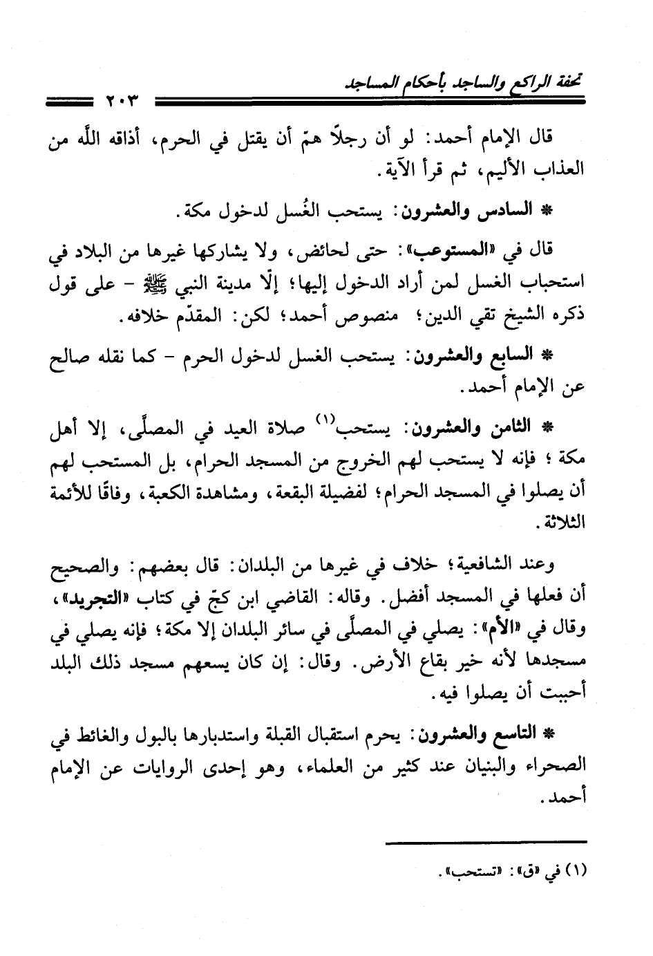 * الثامن والعشرون: يستحب (¬1) صلاة العيد في المصلَّى، إلا أهل مكة؛ فإنه لا يستحب لهم الخروج من المسجد الحرام، بل المستحب لهم أن يصلوا في المسجد الحرام؛ لفضيلة البقعة، ومشاهدة الكعبة، وفاقًا للأئمة الثلاثة.