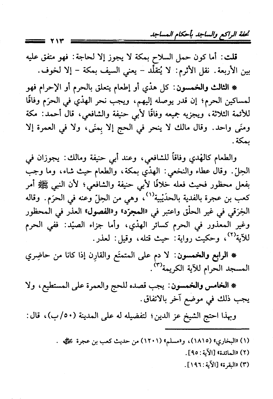 * الثالث والخمسون: كل هدْي أو إطعام يتعلق بالحرم أو الإحرام فهو لمساكين الحرم؛ إن قدر يوصله إليهم، ويجب نحر الهدْي في الحرَم وفاقًا للأئمة الثلاثة، ويجزيه جميعه وفاقًا لأبي حنيفة والشافعي، قال أحمد: مكة ومنَى واحد. وقال مالك لا ينحر في الحج إلا بِمنَى، ولا في العمرة إلا بمكة.