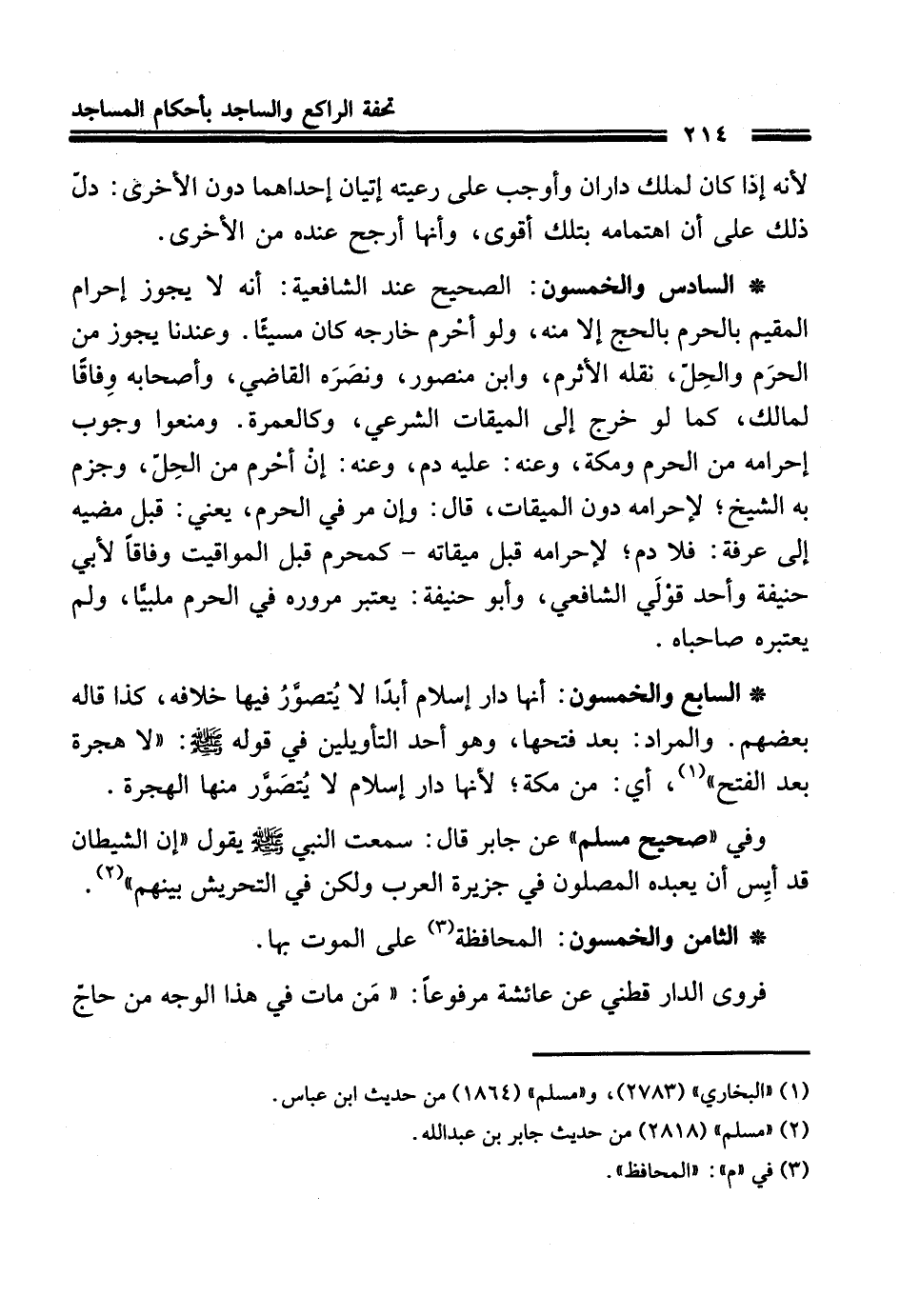 * السادس والخمسون: الصحيح عند الشافعية: أنه لا يجوز إحرام المقيم بالحرم بالحج إلا منه، ولو أحْرم خارجه كان مسيئًا. وعندنا يجوز من الحرَم والحِلّ، نقله الأثرم، وابن منصور، ونصَرَه القاضي، وأصحابه وِفاقًا لمالك، كما لو خرج إلى الميقات الشرعي، وكالعمرة. ومنعوا وجوب إحرامه من الحرم ومكة، وعنه: عليه دم، وعنه: إنْ أحْرم من الحِلّ، وجزم به الشيخ؛ لإحرامه دون الميقات، قال: وإن مر في الحرم، يعني: قبل مضيه إلى عرفة: فلا دم؛ لإحرامه قبل ميقاته - كمحرم قبل المواقيت وفاقًا لأبي حنيفة وأحد قوْلَي الشافعي، وأبو حنيفة: يعتبر مروره في الحرم ملبيًّا، ولم يعتبره صاحباه.