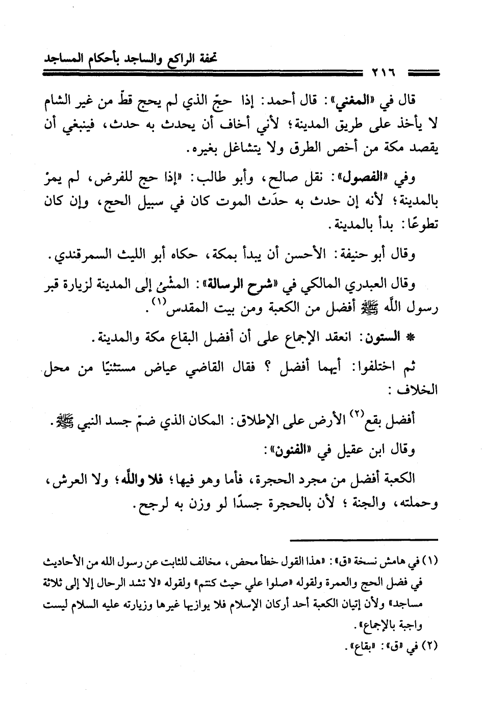 (¬1) في هامش نسخة "ق": "هذا القول خطأ محض، مخالف للثابت عن رسول الله من الأحاديث في فضل الحج والعمرة ولقوله "صلوا علي حيث كنتم" ولقوله "لا تشد الرحال إلا إلى ثلاثة مساجد" ولأن إتيان الكعبة أحد أركان الإسلام فلا يوازيها غيرها وزيارته عليه السلام ليست واجبة بالإجماع".