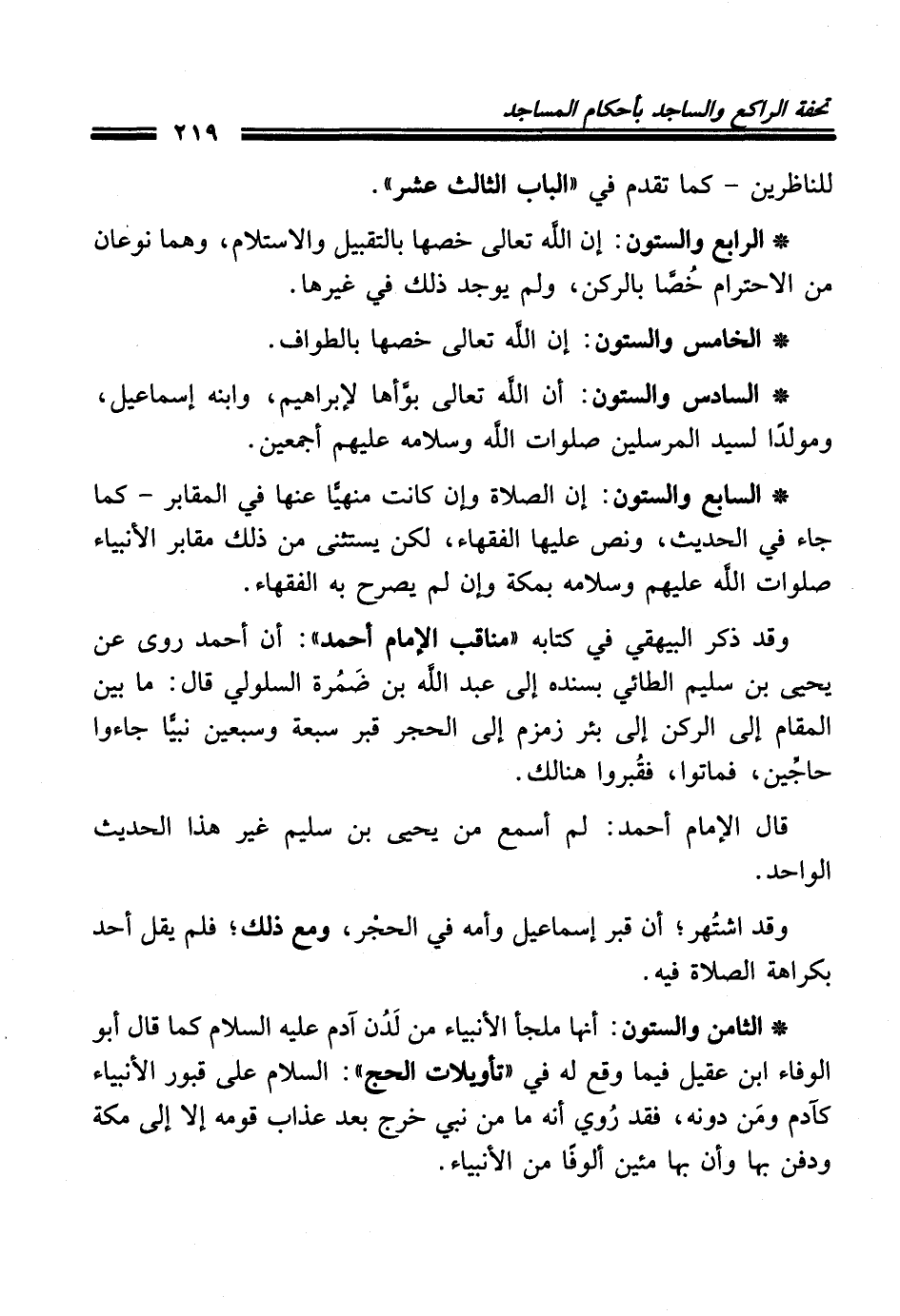 * السابع والستون: إن الصلاة وإن كانت منهيًّا عنها في المقابر- كما جاء في الحديث، ونص عليها الفقهاء، لكن يستثنى من ذلك مقابر الأنبياء صلوات الله عليهم وسلامه بمكة وإن لم يصرح به الفقهاء.