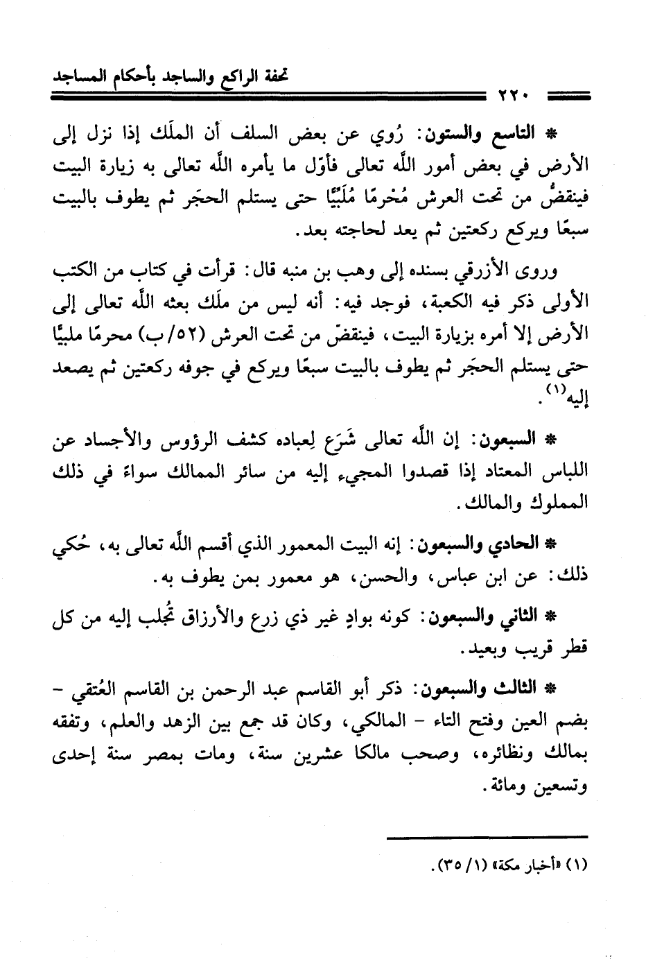وروى الأزرقي بسنده إلى وهب بن منبه قال: قرأت في كتاب من الكتب الأولى ذكر فيه الكعبة، فوجد فيه: أنه ليس من ملَك بعثه الله تعالى إلى الأرض إلا أمره بزيارة البيت، فينقضّ من تحت العرش (52/ ب) محرمًا ملبيًّا حتى يستلم الحجَر ثم يطوف بالبيت سبعًا ويركع في جوفه ركعتين ثم يصعد إليه (¬1).