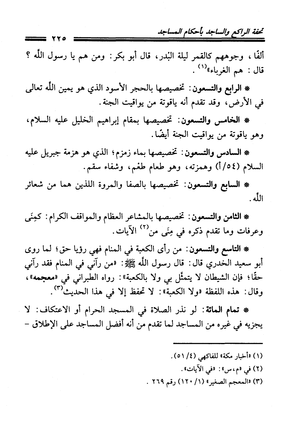 * تمام المائة: لو نذر الصلاة في المسجد الحرام أو الاعتكاف: لا يجزيه في غيره من المساجد لما تقدم من أنه أفضل المساجد على الإطلاق -