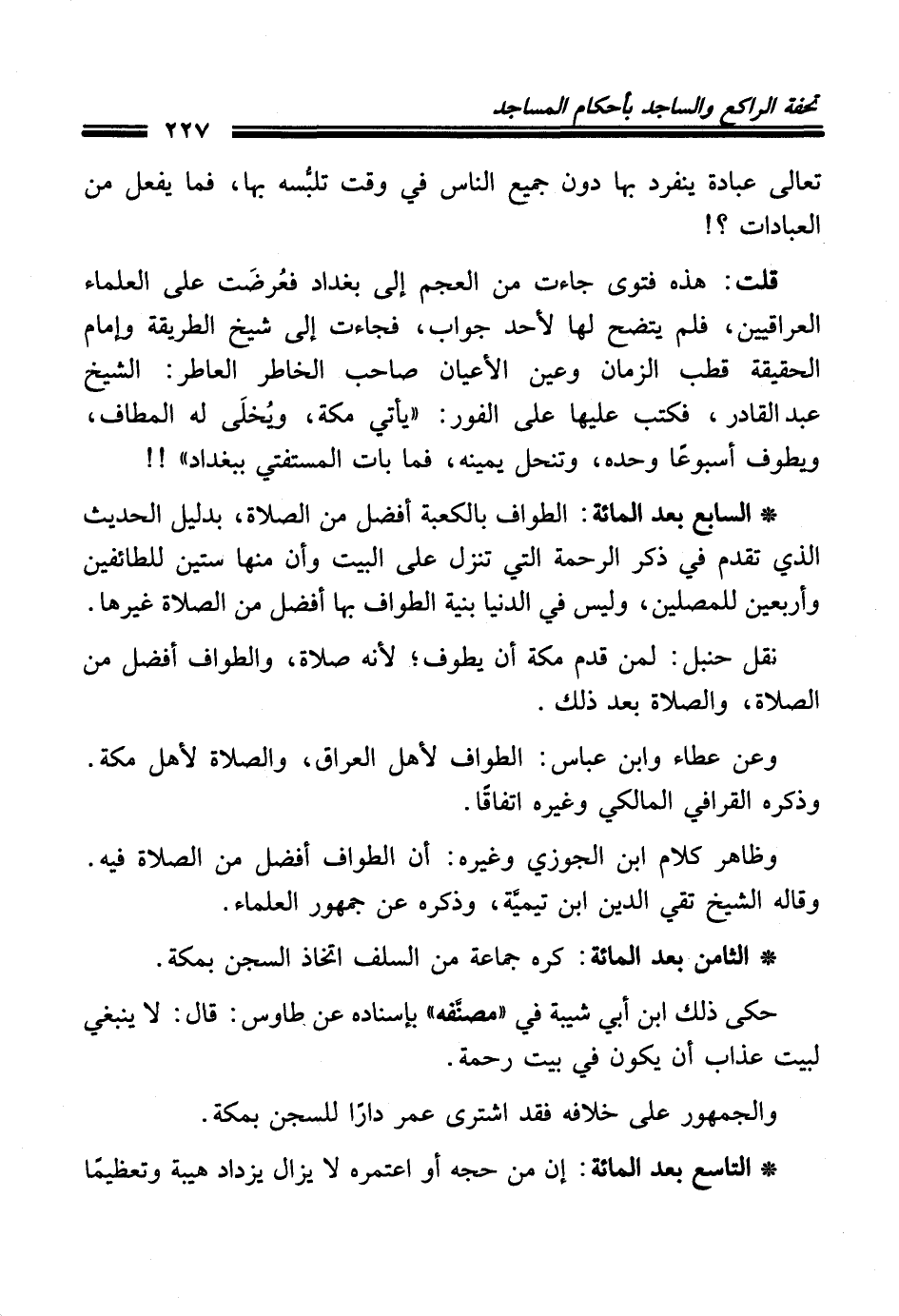* السابع بعد المائة: الطواف بالكعبة أفضل من الصلاة، بدليل الحديث الذي تقدم في ذكر الرحمة التي تنزل على البيت وأن منها ستين للطائفين وأربعين للمصلين، وليس في الدنيا بنية الطواف بها أفضل من الصلاة غيرها.
