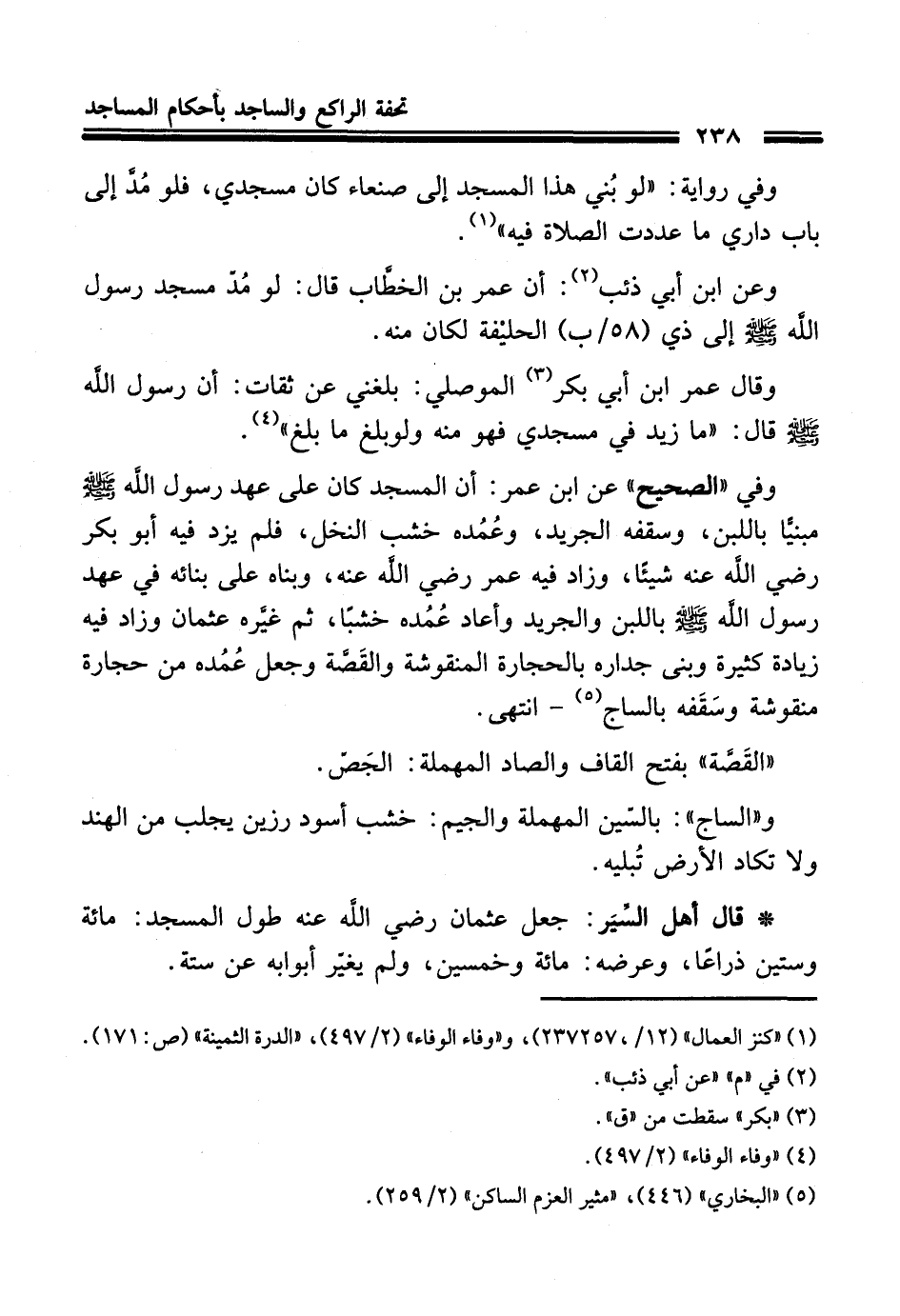 وفي "الصحيح" عن ابن عمر: أن المسجد كان على عهد رسول الله - صلى الله عليه وسلم - مبنيًّا باللبن، وسقفه الجريد، وعُمُده خشب النخل، فلم يزد فيه أبو بكر رضي الله عنه شيئًا، وزاد فيه عمر رضي الله عنه، وبناه على بنائه في عهد رسول الله - صلى الله عليه وسلم - باللبن والجريد وأعاد عُمُده خشبًا، ثم غيَّره عثمان وزاد فيه زيادة كثيرة وبنى جداره بالحجارة المنقوشة والقَصَّة وجعل عُمُده من حجارة منقوشة وسَقَفه بالساج (¬5) - انتهى.