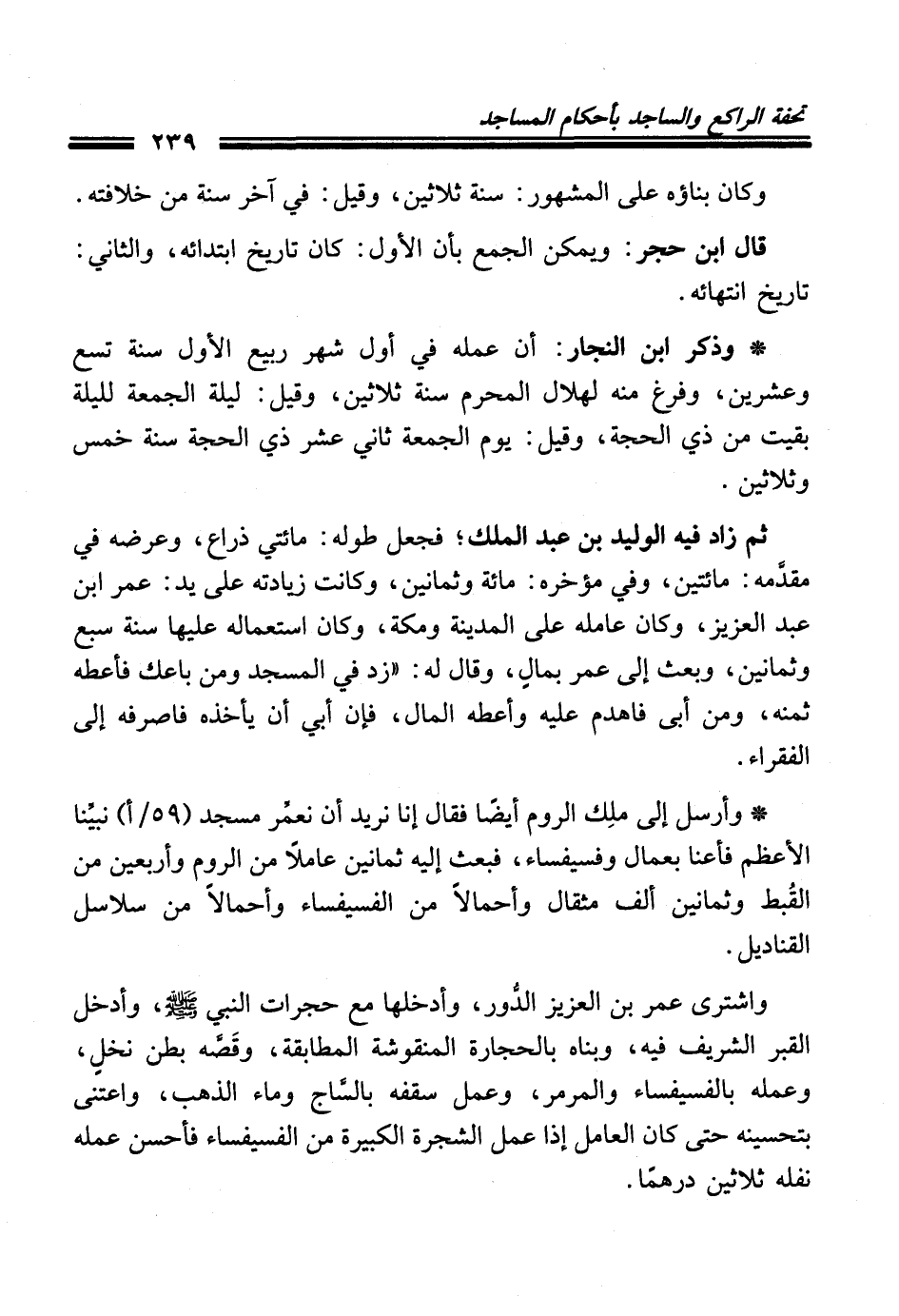 * وأرسل إلى ملِك الروم أيضًا فقال إنا نريد أن نعمِّر مسجد (59/ أ) نبيِّنا الأعظم فأعنا بعمال وفسيفساء، فبعث إليه ثمانين عاملًا من الروم وأربعين من القُبط وثمانين ألف مثقال وأحمالًا من الفسيفساء وأحمالًا من سلاسل القناديل.