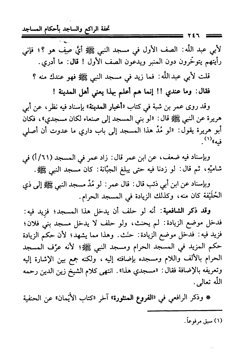 وقد ذكر الشافعية: أنه لو حلف أن يدخل هذا المسجد؛ فزِيد فيه: فدخل موضع الزيادة: لم يحنث، ولو حلف لا يدخل مسجد بني فلان؛ فزيد فيه: فدخل موضع الزيادة: حنَث. وهذا مما يشهد؛ لأن حكم الزيادة حكم المزيد في المسجد الحرام ومسجد النبي - صلى الله عليه وسلم -؛ لأنه عرَّف المسجد الحرام بالألف واللام ومسجده بإضافته إليه، ولكنه جمع بين الإشارة إليه وتعريفه بالإضافة فقال: "مسجدي هذا". انتهى كلام الشيخ زين الدين رحمه الله تعالى.