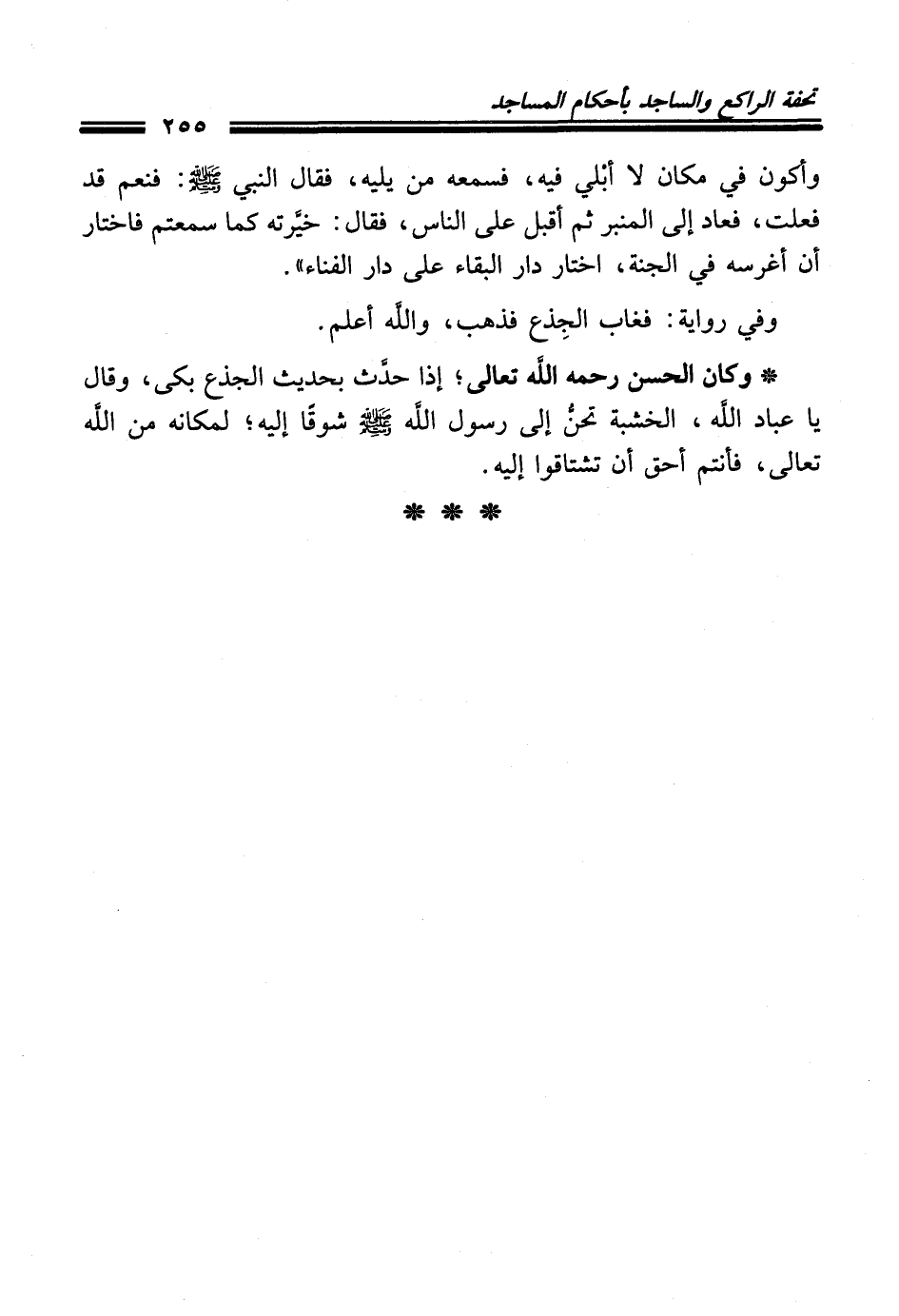 * وكان الحسن رحمه الله تعالى؛ إذا حدَّث بحديث الجذع بكى، وقال يا عباد الله، الخشبة تحنُّ إلى رسول الله - صلى الله عليه وسلم - شوقًا إليه؛ لمكانه من الله تعالى، فأنتم أحق أن تشتاقوا إليه.
