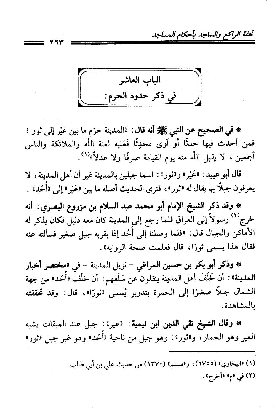 * في الصحيح عن النبي - صلى الله عليه وسلم - أنَّه قال: "المدينة حرَم ما بين عَيْر إلى ثور؛ فمن أحدث فيها حدثًا أو آوى محدِثًا فَعَليه لعنة الله والملائكة والناس أجمعين، لا يقبل الله منه يوم القيامة صرفًا ولا عدلًا" (¬1).
