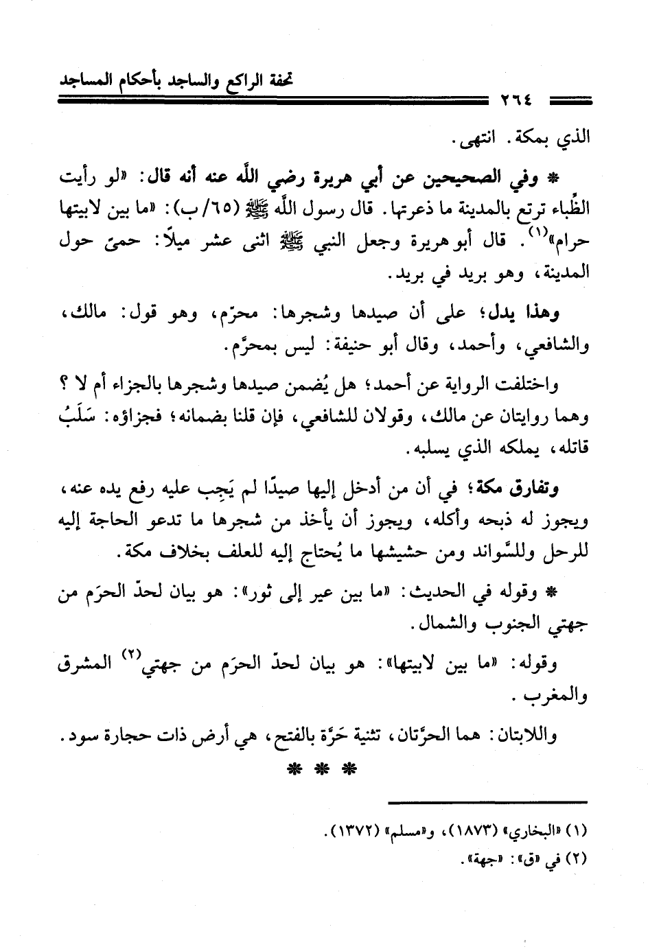 وهذا يدل؛ على أن صيدها وشجرها: محرَّم، وهو قول: مالك، والشافعي، وأحمد، وقال أبو حنيفة: ليس بمحرَّم.
