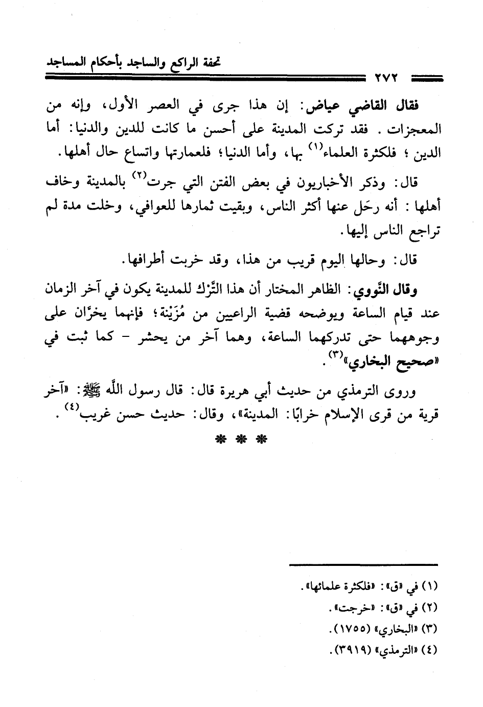 وروى الترمذي من حديث أبي هريرة قال: قال رسول الله - صلى الله عليه وسلم - "آخر قرية من قرى الإسلام خرابًا: المدينة"، وقال: حديث حسن غريب (¬4).