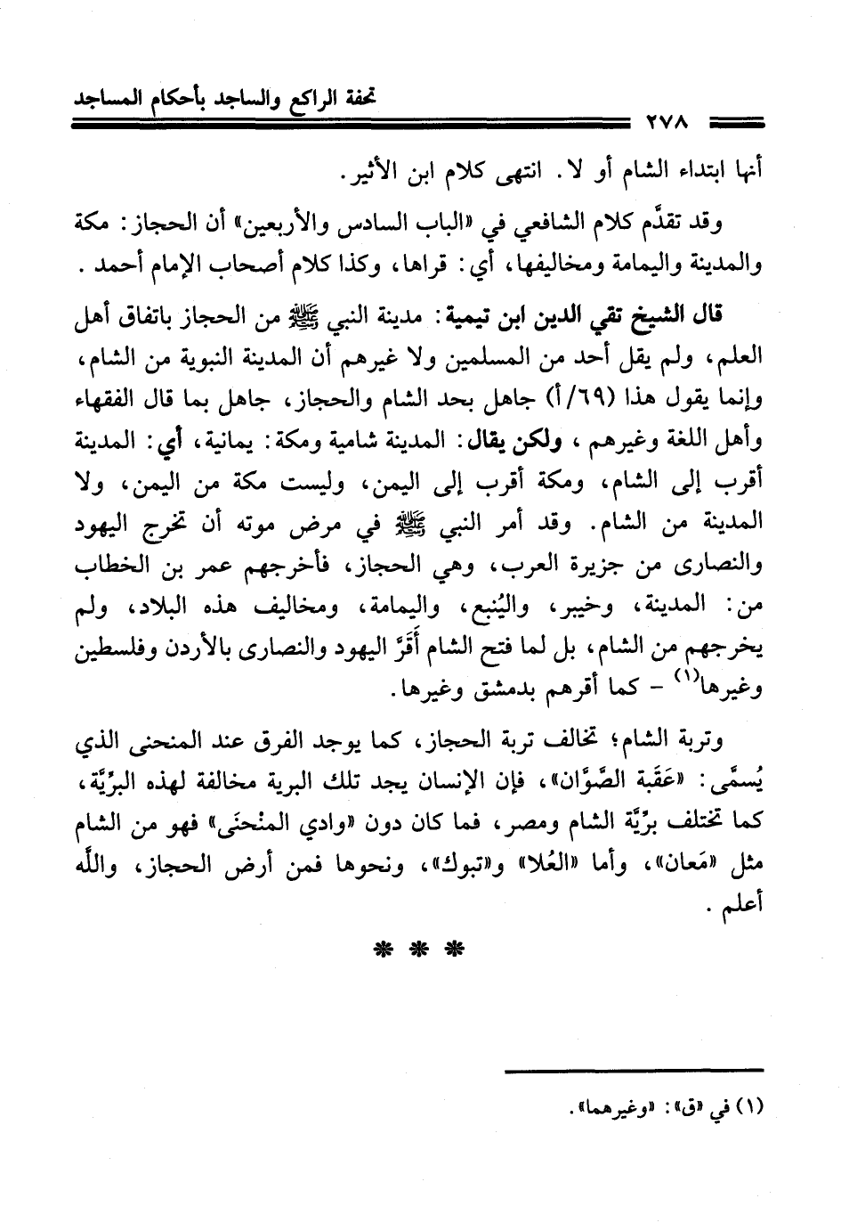 قال الشيخ تقي الدين ابن تيمية: مدينة النبي - صلى الله عليه وسلم - من الحجاز باتفاق أهل العلم، ولم يقل أحد من المسلمين ولا غيرهم أن المدينة النبوية من الشام، وإنما يقول هذا (69/ أ) جاهل بحد الشام والحجاز، جاهل بما قال الفقهاء وأهل اللغة وغيرهم، ولكن يقال: المدينة شامية ومكة: يمانية، أي: المدينة أقرب إلى الشام، ومكة أقرب إلى اليمن، وليست مكة من اليمن، ولا المدينة من الشام. وقد أمر النبي - صلى الله عليه وسلم - في مرض موته أن تخرج اليهود والنصارى من جزيرة العرب، وهي الحجاز، فأخرجهم عمر بن الخطاب من: المدينة، وخيبر، واليُنبع، واليمامة، ومخاليف هذه البلاد، ولم يخرجهم من الشام، بل لما فتح الشام أَقَرَّ اليهود والنصارى بالأردن وفلسطين وغيرها (¬1) - كما أقرهم بدمشق وغيرها.