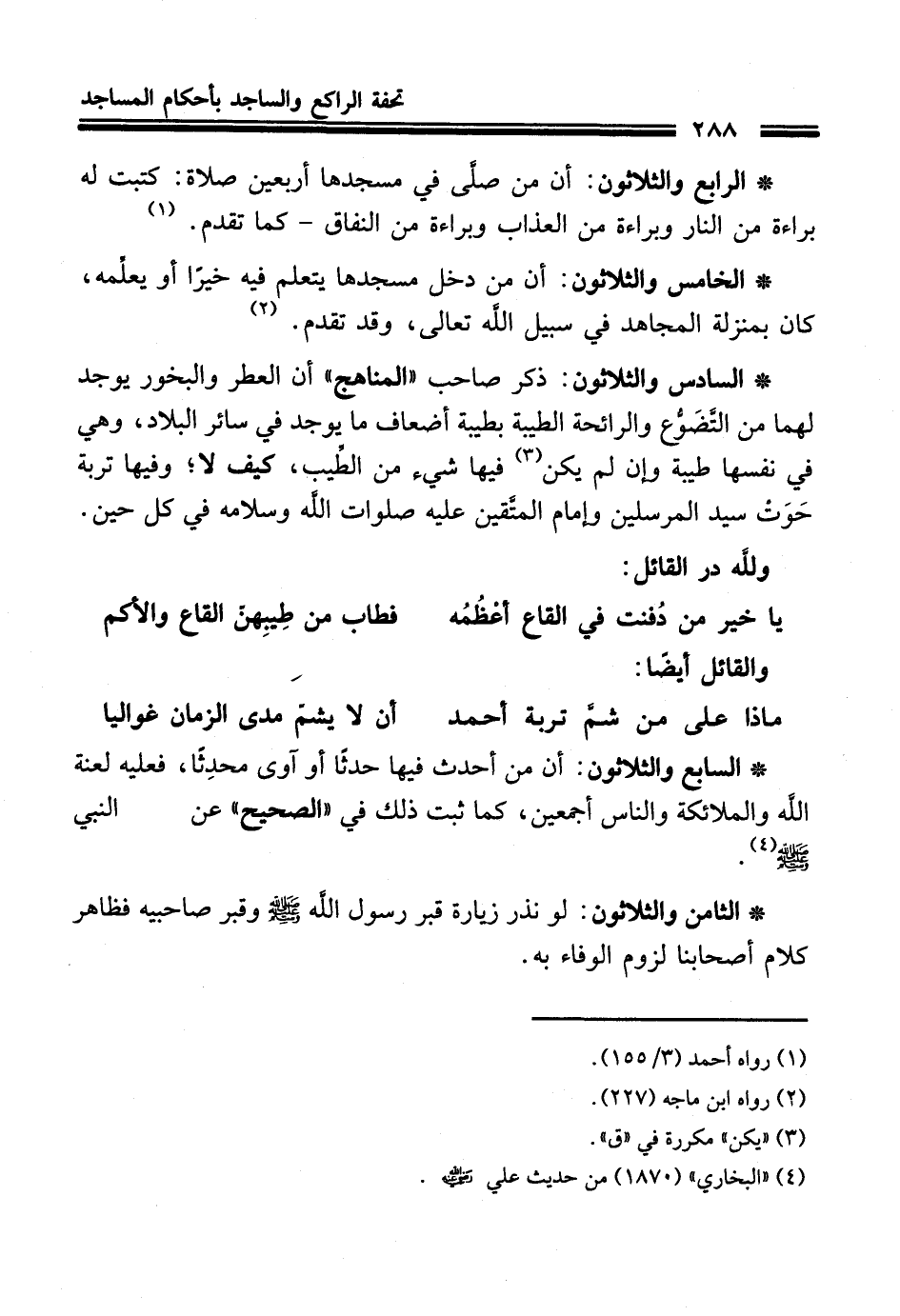 * السادس والثلاثون: ذكر صاحب "المناهج" أن العطر والبخور يوجد لهما من التَّضَوُّع والرائحة الطيبة بطيبة أضعاف ما يوجد في سائر البلاد، وهي في نفسها طيبة وإن لم يكن (¬3) فيها شيء من الطيب، كيف لا؛ وفيها تربة حَوَتْ سيد المرسلين وإمام المتَّقين عليه صلوات الله وسلامه في كل حين.