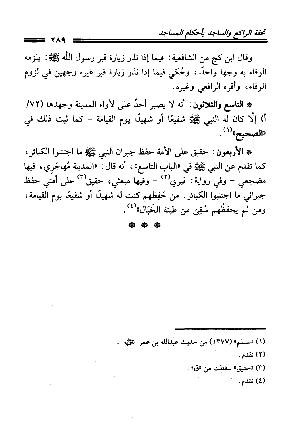 * الأربعون: حقيق على الأمة حفظ جيران النبي - صلى الله عليه وسلم - ما اجتنبوا الكبائر، كما تقدم عن النبي - صلى الله عليه وسلم - في "الباب التاسع"، أنَّه قال: "المدينة مُهاجَرِي، فيها مضجعي - وفي رواية: قبري (¬2) - وفيها مبعثي، حقيق (¬3) على أمتي حفظ جيراني ما اجتنبوا الكبائر. من حَفِظهم كنت له شهيدًا أو شفيعًا يوم القيامة، ومن لم يحفظهم سُقِىَ من طينة الخَبَال" (¬4).