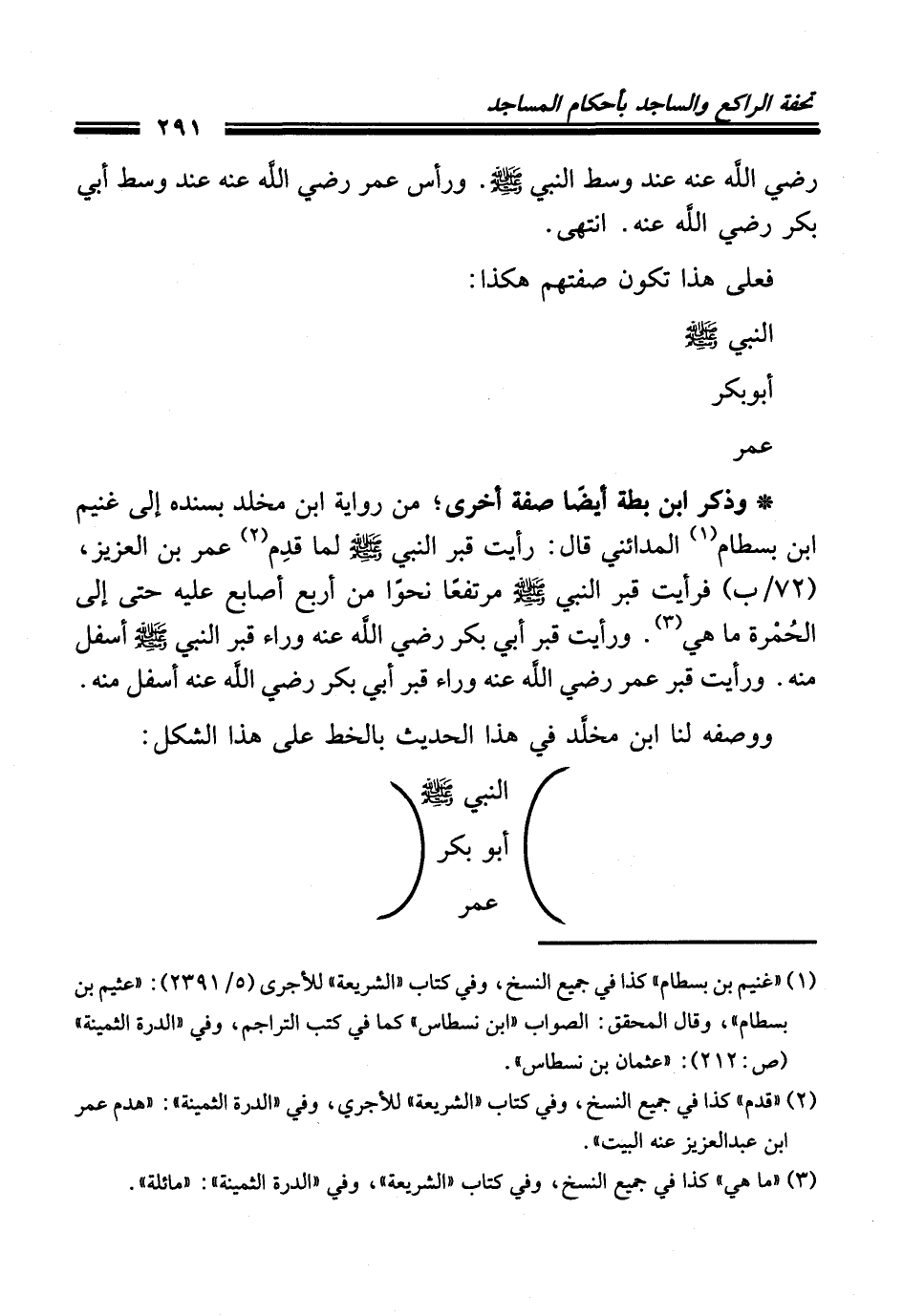 * ذكر ابن بطة أيضًا صفة أخرى؛ من رواية ابن مخلد بسنده إلى غنيم ابن بسطام (¬1) المدائني قال: رأيت قبر النبي - صلى الله عليه وسلم - لما قدِم (¬2) عمر بن العزيز، (72/ب) فرأيت قبر النبي - صلى الله عليه وسلم - مرتفعًا نحوًا من أربع أصابع عليه حتَّى إلى الحُمْرة ما هي (¬3). ورأيت قبر أبي بكر رضي الله عنه وراء قبر النبي - صلى الله عليه وسلم - أسفل منه. ورأيت قبر عمر رضي الله عنه وراء قبر أبي بكر رضي الله عنه أسفل منه.