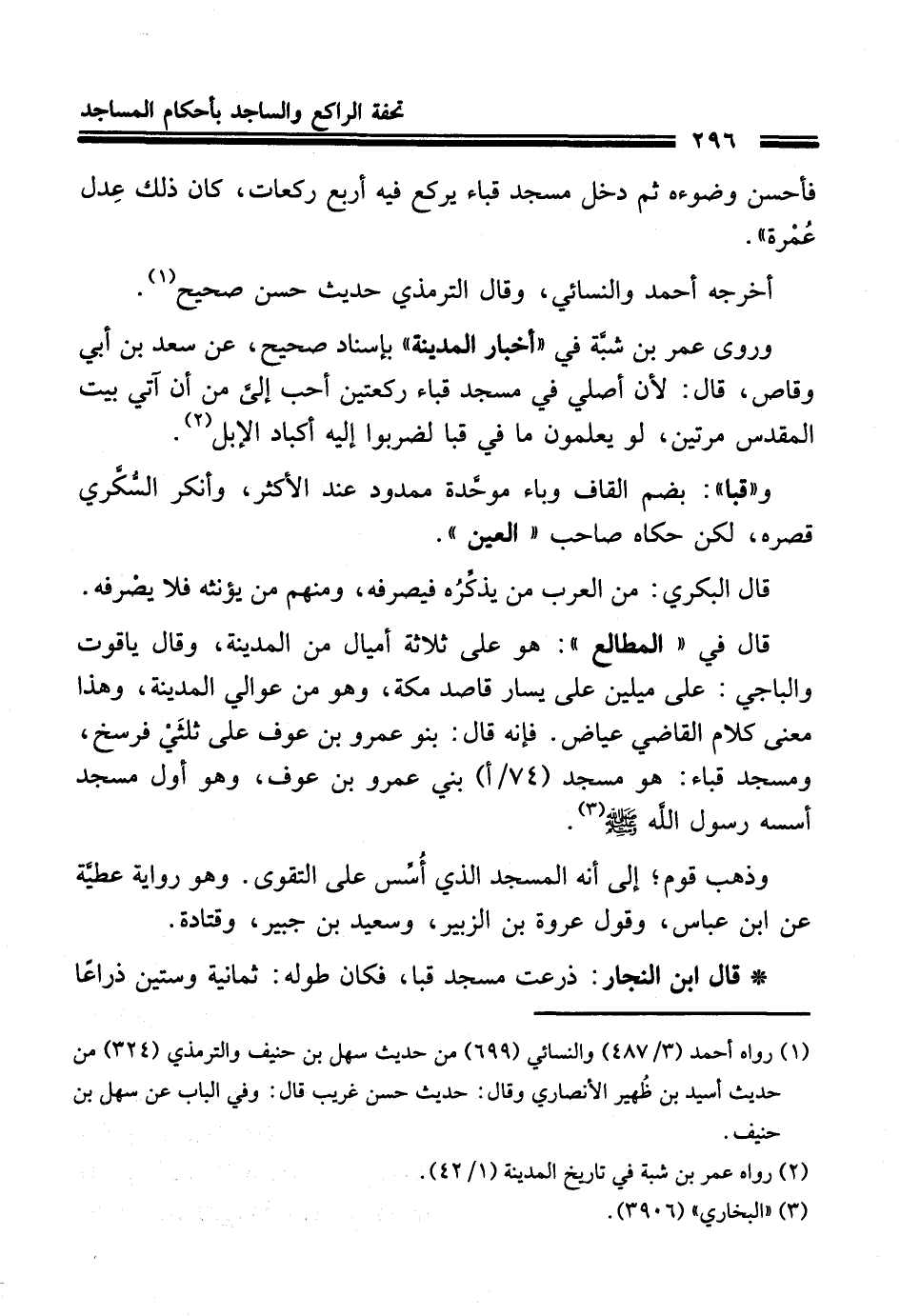 وروى عمر بن شبَّة في "أخبار المدينة" بإسناد صحيح، عن سعد بن أبي وقاص، قال: لأن أصلي في مسجد قباء ركعتين أحب إليَّ من أن آتي بيت المقدس مرتين، لو يعلمون ما في قبا لضربوا إليه أكباد الإبل (¬2).