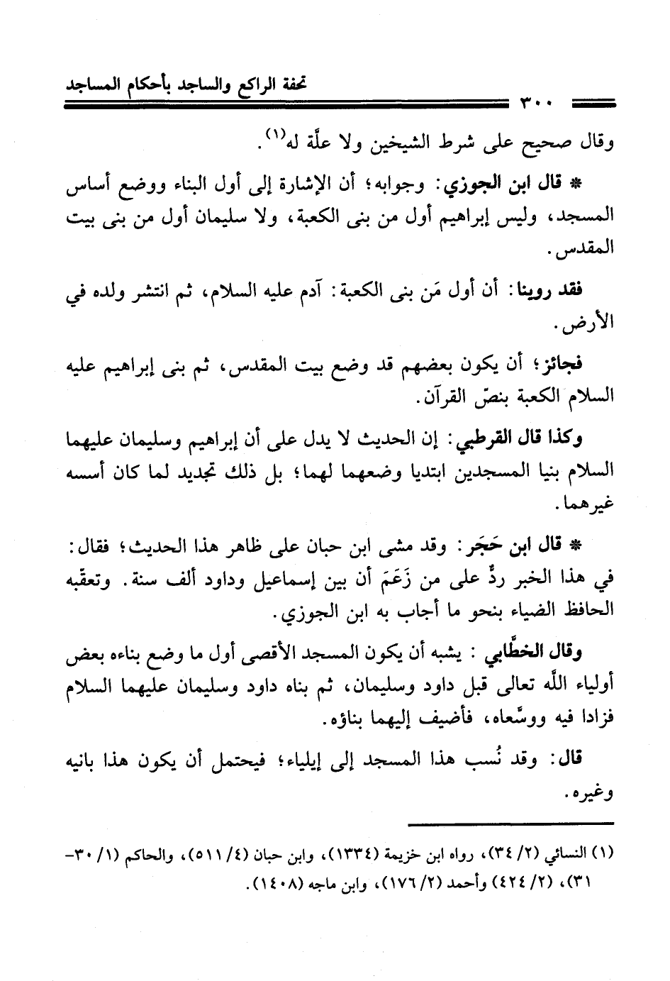 وكذا قال القرطبي: إن الحديث لا يدل على أن إبراهيم وسليمان عليهما السلام بنيا المسجدين ابتديا وضعهما لهما؛ بل ذلك تجديد لما كان أسسه غيرهما.