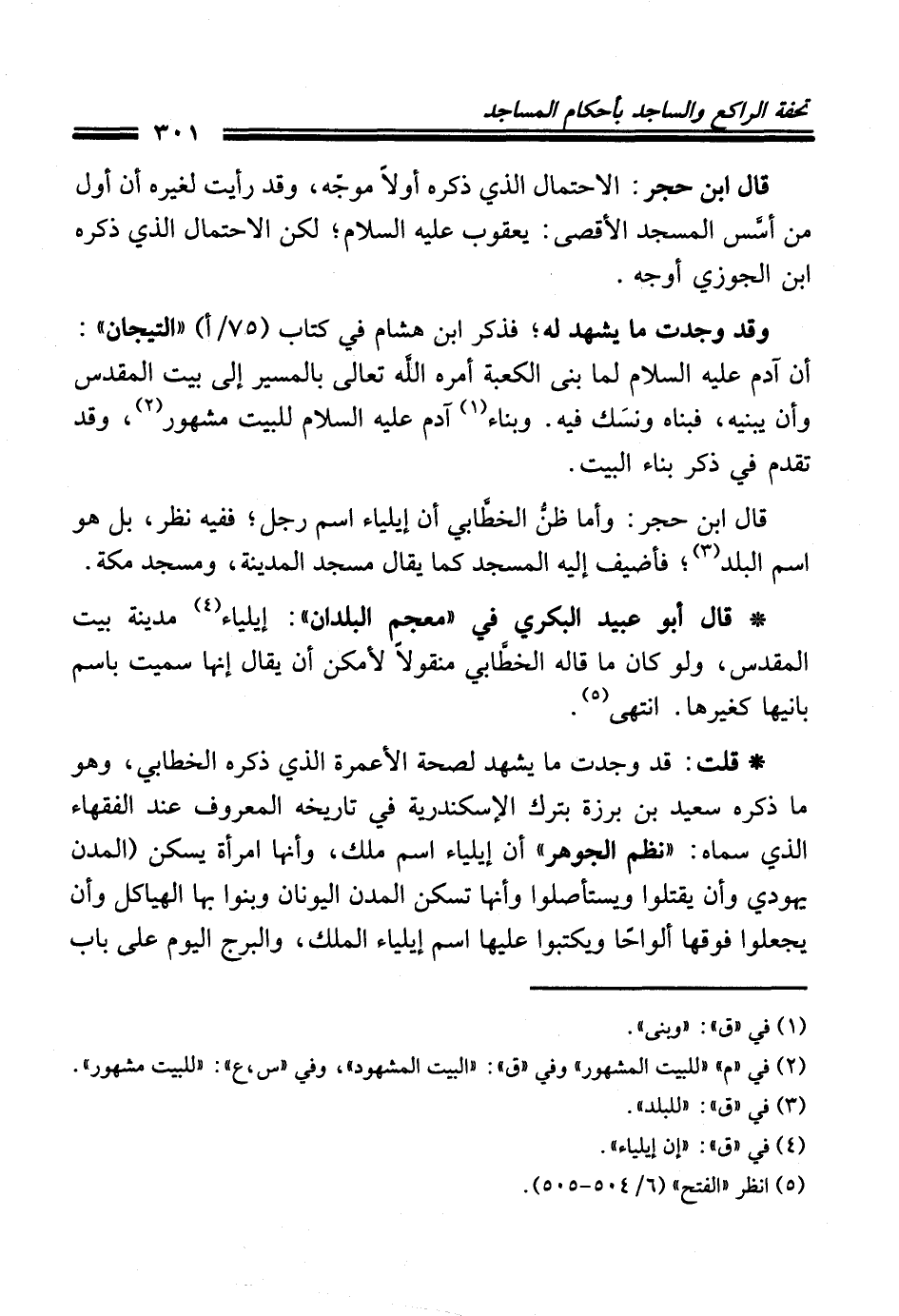 قال ابن حجر: وأما ظنُّ الخطَّابي أن إيلياء اسم رجل؛ ففيه نظر، بل هو اسم البلد (¬3)؛ فأضيف إليه المسجد كما يقال مسجد المدينة، ومسجد مكة.