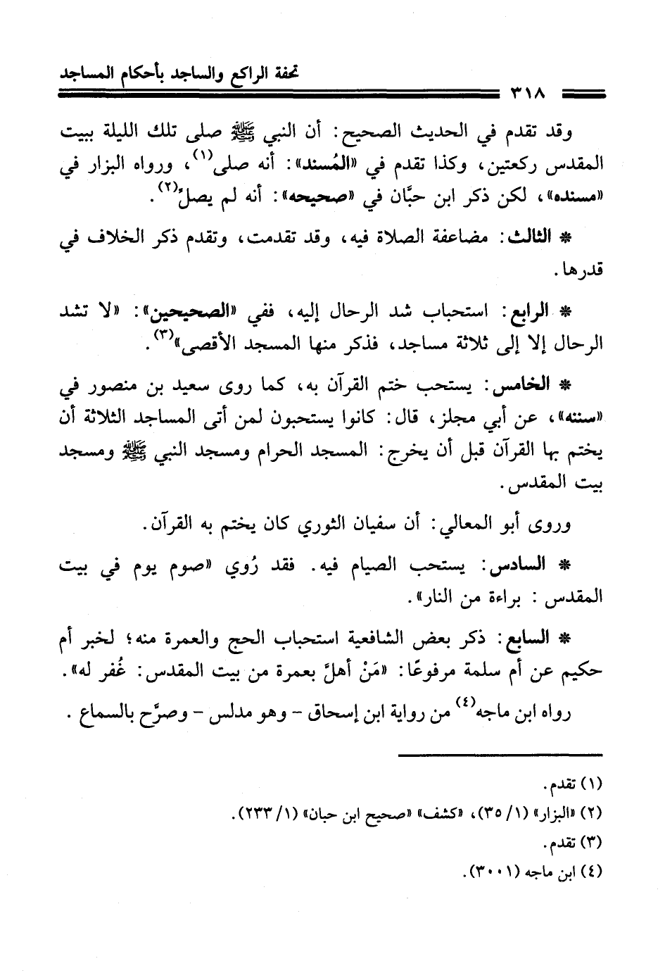 * الرابع: استحباب شد الرحال إليه، ففي "الصحيحين": "لا تشد الرحال إلا إلى ثلاثة مساجد، فذكر منها المسجد الأقصى" (¬3).