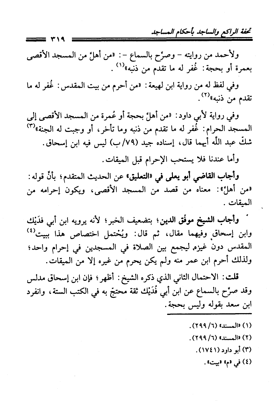 وفي رواية لأبي داود: "من أهلَّ بحجة أو عُمرة من المسجد الأقصى إلى المسجد الحرام: غُفر له ما تقدم من ذنبه وما تأخر، أو وجبت له الجنة" (¬3) شكَّ عبد الله أيهما قال، إسناده جيد (79/ ب) ليس فيه ابن إسحاق.