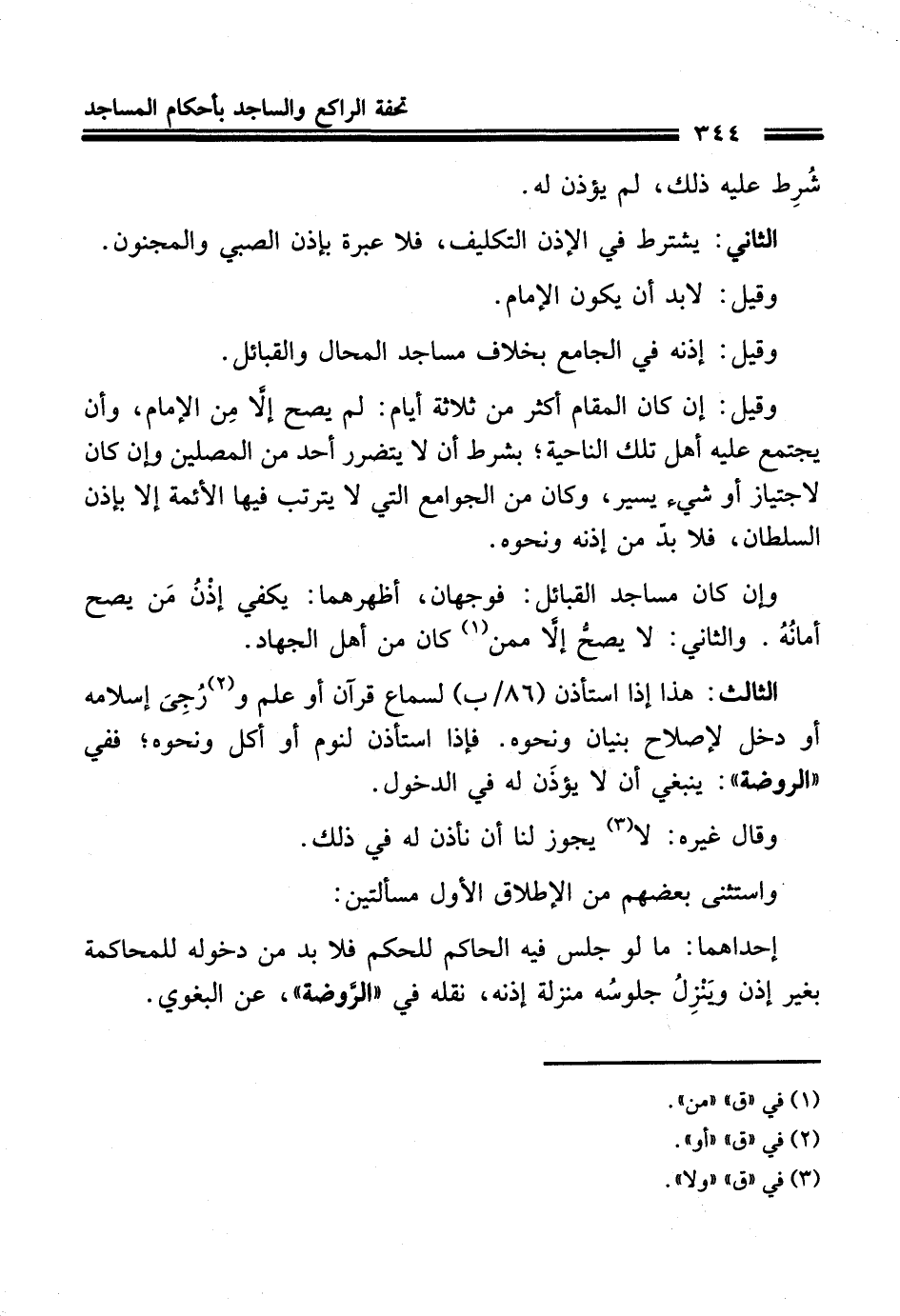 وقيل: إن كان المقام أكثر من ثلاثة أيام: لم يصح إلَّا مِن الإمام، وأن يجتمع عليه أهل تلك الناحية؛ بشرط أن لا يتضرر أحد من المصلين وإن كان لاجتياز أو شيء يسير، وكان من الجوامع التي لا يترتب فيها الأئمة إلا بإذن السلطان، فلا بدَّ من إذنه ونحوه.