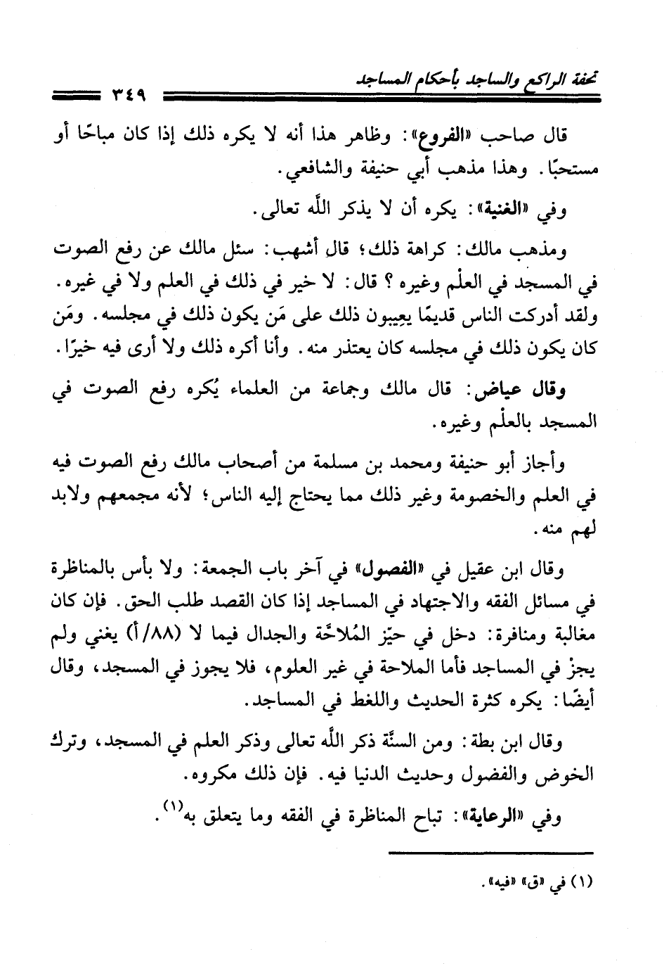 وقال ابن عقيل في "الفصول" في آخر باب الجمعة: ولا بأس بالمناظرة في مسائل الفقه والاجتهاد في المساجد إذا كان القصد طلب الحق. فإن كان مغالبة ومنافرة: دخل في حيِّز المُلاحَّة والجدال فيما لا (88/أ) يغني ولم يجزْ في المساجد فأما الملاحة في غير العلوم، فلا يجوز في المسجد، وقال أيضًا: يكره كثرة الحديث واللغط في المساجد.